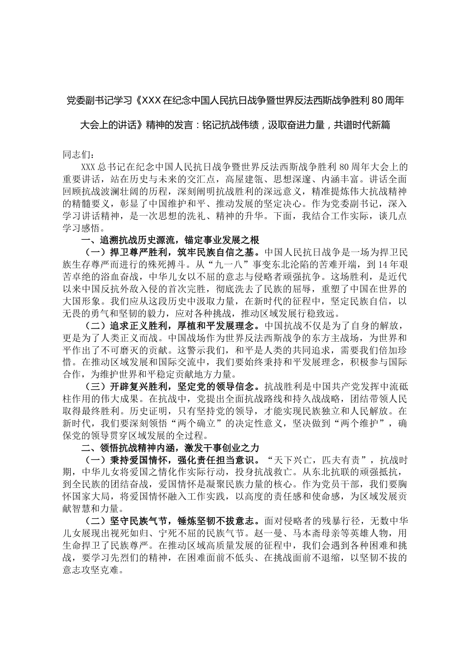 黨委副書記學(xué)習(xí)《XXX在紀(jì)念中國人民抗日戰(zhàn)爭暨世界反法西斯戰(zhàn)爭勝利80周年大會上的講話》精神的發(fā)言:銘記抗戰(zhàn)偉績,汲取奮進(jìn)力量,共譜時(shí)代新篇同志們:XXX總書記在紀(jì)念中國人民抗日戰(zhàn)爭暨世界反法西斯戰(zhàn)爭勝利80周年大會上的重要講話,站在歷史與未來的交匯點(diǎn),高屋建瓴、思想深邃、內(nèi)涵豐富。講話全面回顧抗戰(zhàn)波瀾壯闊的歷程,深刻闡明抗戰(zhàn)勝利的深遠(yuǎn)意義,精準(zhǔn)提煉偉大抗戰(zhàn)精神的精髓要義,彰顯了中國維護(hù)和平、推動發(fā)展的堅(jiān)定決心。作為黨委副書記,深入學(xué)習(xí)講話精神,是一次思想的洗禮、精神的升華。下面,我結(jié)合工作實(shí)際,談幾點(diǎn)學(xué)習(xí)感悟。一、追溯抗戰(zhàn)歷史源流,...