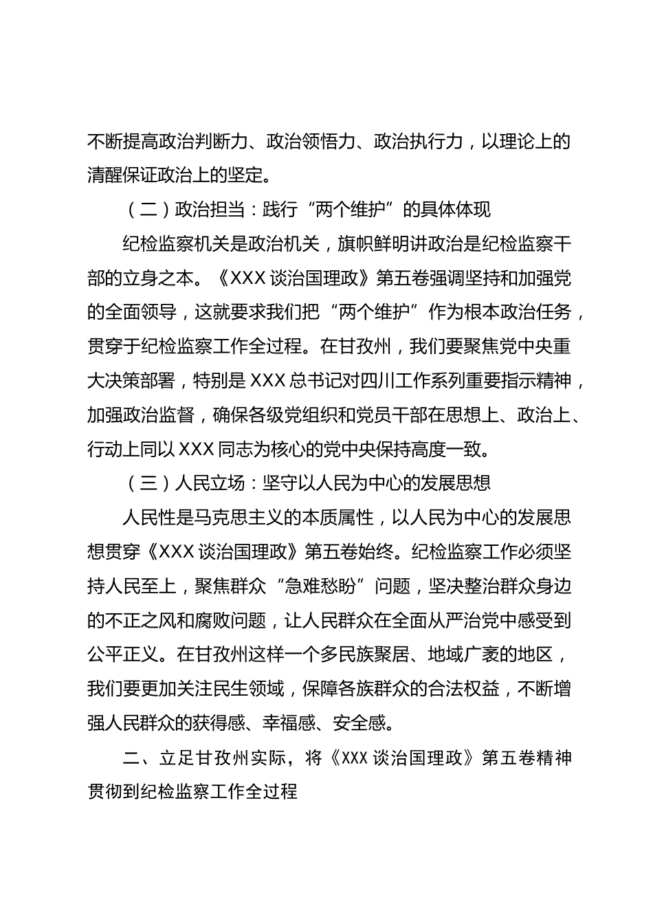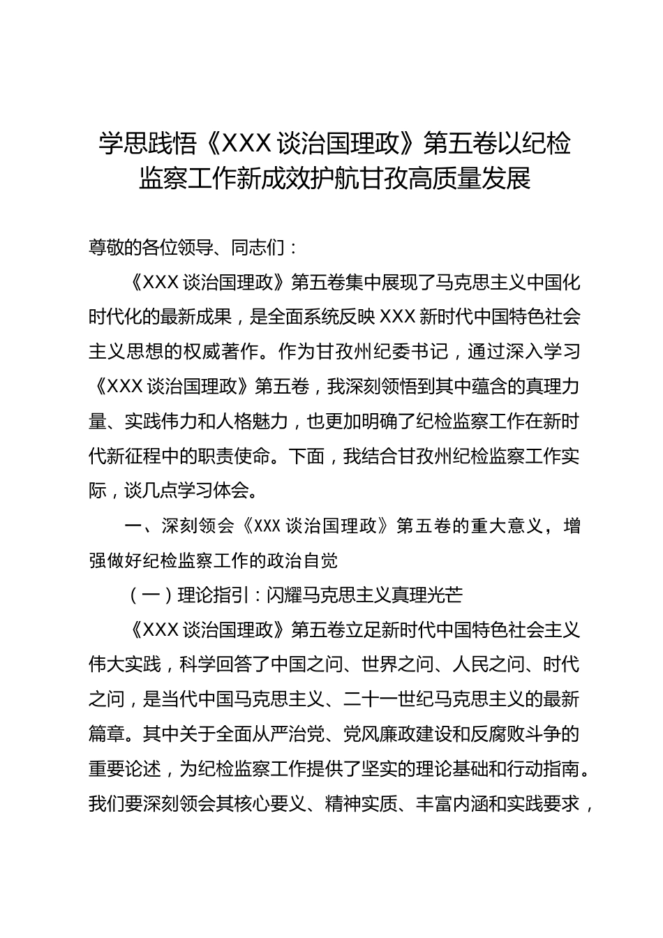 學(xué)思踐悟《XXX談治國(guó)理政》第五卷以紀(jì)檢監(jiān)察工作新成效護(hù)航甘孜高質(zhì)量發(fā)展尊敬的各位領(lǐng)導(dǎo)、同志們:《XXX談治國(guó)理政》第五卷集中展現(xiàn)了馬克思主義中國(guó)化時(shí)代化的最新成果,是全面系統(tǒng)反映XXX新時(shí)代中國(guó)特色社會(huì)主義思想的權(quán)威著作。作為甘孜州紀(jì)委書(shū)記,通過(guò)深入學(xué)習(xí)《XXX談治國(guó)理政》第五卷,我深刻領(lǐng)悟到其中蘊(yùn)含的真理力量、實(shí)踐偉力和人格魅力,也更加明確了紀(jì)檢監(jiān)察工作在新時(shí)代新征程中的職責(zé)使命。下面,我結(jié)合甘孜州紀(jì)檢監(jiān)察工作實(shí)際,談幾點(diǎn)學(xué)習(xí)體會(huì)。一、深刻領(lǐng)會(huì)《XXX談治國(guó)理政》第五卷的重大意義,增強(qiáng)做好紀(jì)檢監(jiān)察工作的政治自覺(jué)(一)理論指引:閃耀馬克...