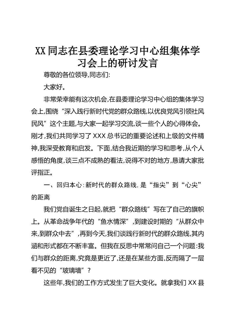 XX同志在縣委理論學(xué)習(xí)中心組集體學(xué)習(xí)會(huì)上的研討發(fā)言尊敬的各位領(lǐng)導(dǎo),同志們:大家好。非常榮幸能有這次機(jī)會(huì),在縣委理論學(xué)習(xí)中心組的集體學(xué)習(xí)會(huì)上,圍繞“深入踐行新時(shí)代黨的群眾路線,以優(yōu)良黨風(fēng)引領(lǐng)社風(fēng)民風(fēng)”這個(gè)主題,與大家一起學(xué)習(xí)交流,談一些個(gè)人的心得體會(huì)。剛才,我們共同學(xué)習(xí)了XXX總書記的重要論述和上級(jí)的文件精神,我深受教育和啟發(fā)。下面,結(jié)合我近期的學(xué)習(xí)和思考,從個(gè)人感悟的角度,談三點(diǎn)不成熟的看法,說得不對的地方,懇請大家批評指正。一、回歸本心:新時(shí)代的群眾路線,是“指尖”到“心尖”的距離我們黨自誕生之日起,就把“群眾路線”寫在了自己的旗幟上。從革命戰(zhàn)...