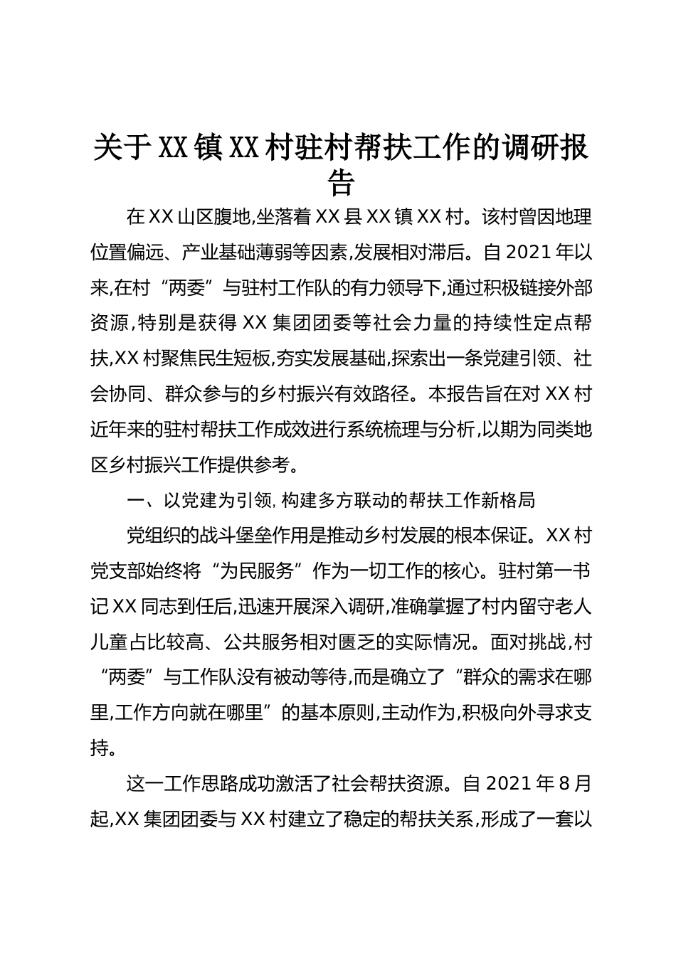 關(guān)于XX鎮(zhèn)XX村駐村幫扶工作的調(diào)研報告在XX山區(qū)腹地,坐落著XX縣XX鎮(zhèn)XX村。該村曾因地理位置偏遠、產(chǎn)業(yè)基礎(chǔ)薄弱等因素,發(fā)展相對滯后。自2021年以來,在村“兩委”與駐村工作隊的有力領(lǐng)導下,通過積極鏈接外部資源,特別是獲得XX集團團委等社會力量的持續(xù)性定點幫扶,XX村聚焦民生短板,夯實發(fā)展基礎(chǔ),探索出一條黨建引領(lǐng)、社會協(xié)同、群眾參與的鄉(xiāng)村振興有效路徑。本報告旨在對XX村近年來的駐村幫扶工作成效進行系統(tǒng)梳理與分析,以期為同類地區(qū)鄉(xiāng)村振興工作提供參考。一、以黨建為引領(lǐng),構(gòu)建多方聯(lián)動的幫扶工作新格局黨組織的戰(zhàn)斗堡壘作用是推動鄉(xiāng)村發(fā)展的根本保證。XX村黨支部始終將...