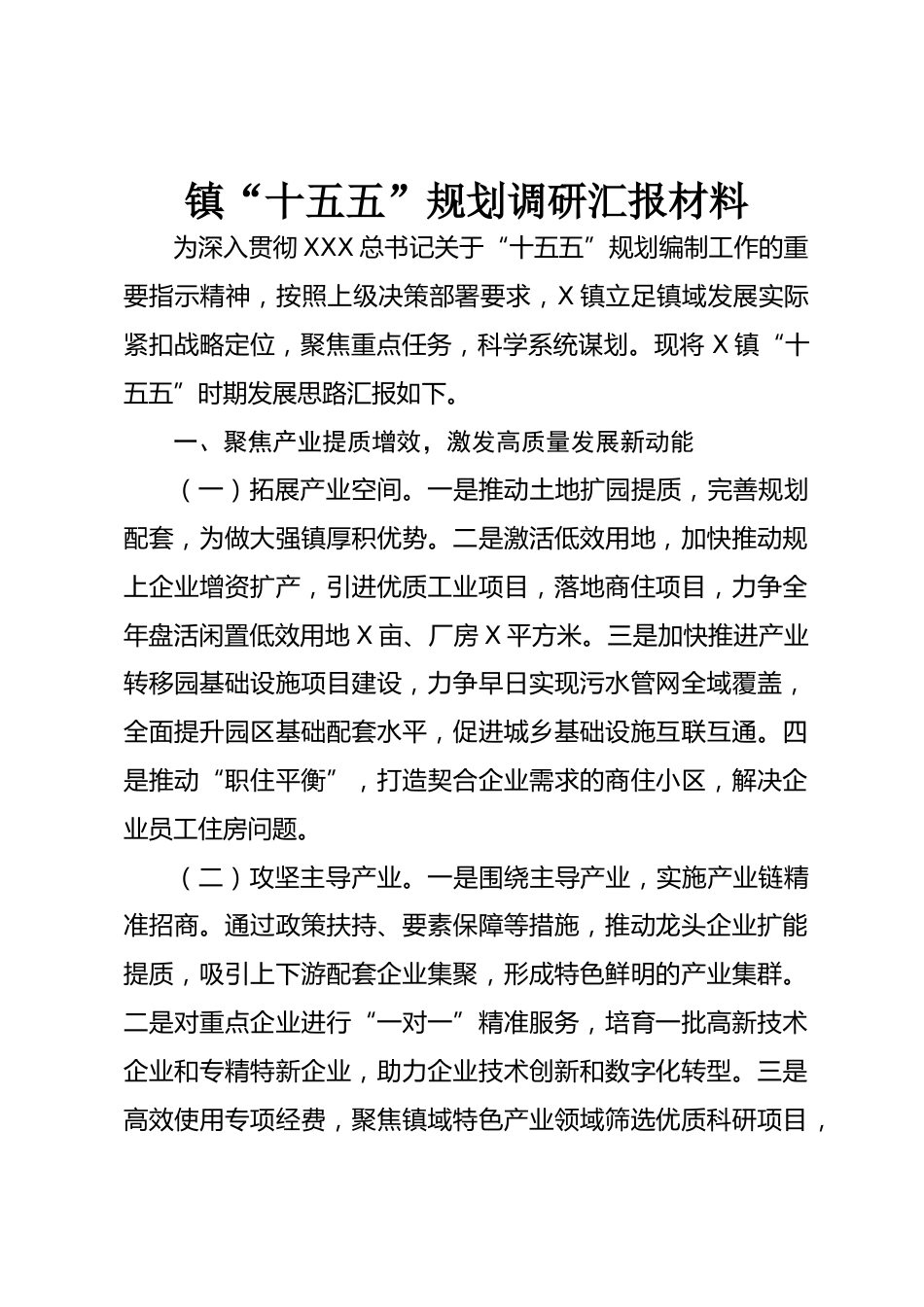 鎮(zhèn)“十五五”規(guī)劃調(diào)研匯報材料為深入貫徹XXX總書記關(guān)于“十五五”規(guī)劃編制工作的重要指示精神,按照上級決策部署要求,X鎮(zhèn)立足鎮(zhèn)域發(fā)展實際緊扣戰(zhàn)略定位,聚焦重點任務(wù),科學系統(tǒng)謀劃?,F(xiàn)將X鎮(zhèn)“十五五”時期發(fā)展思路匯報如下。一、聚焦產(chǎn)業(yè)提質(zhì)增效,激發(fā)高質(zhì)量發(fā)展新動能(一)拓展產(chǎn)業(yè)空間。一是推動土地擴園提質(zhì),完善規(guī)劃配套,為做大強鎮(zhèn)厚積優(yōu)勢。二是激活低效用地,加快推動規(guī)上企業(yè)增資擴產(chǎn),引進優(yōu)質(zhì)工業(yè)項目,落地商住項目,力爭全年盤活閑置低效用地X畝、廠房X平方米。三是加快推進產(chǎn)業(yè)轉(zhuǎn)移園基礎(chǔ)設(shè)施項目建設(shè),力爭早日實現(xiàn)污水管網(wǎng)全域覆蓋,全面提升園區(qū)...