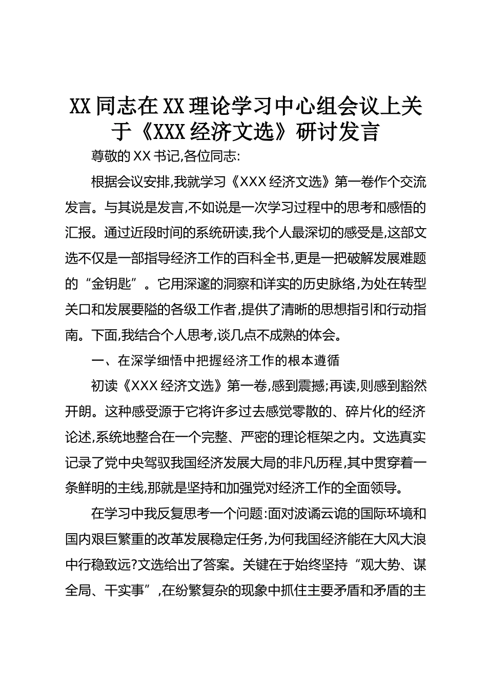 XX同志在XX理論學(xué)習(xí)中心組會議上關(guān)于《XXX經(jīng)濟(jì)文選》研討發(fā)言尊敬的XX書記,各位同志:根據(jù)會議安排,我就學(xué)習(xí)《XXX經(jīng)濟(jì)文選》第一卷作個(gè)交流發(fā)言。與其說是發(fā)言,不如說是一次學(xué)習(xí)過程中的思考和感悟的匯報(bào)。通過近段時(shí)間的系統(tǒng)研讀,我個(gè)人最深切的感受是,這部文選不僅是一部指導(dǎo)經(jīng)濟(jì)工作的百科全書,更是一把破解發(fā)展難題的“金鑰匙”。它用深邃的洞察和詳實(shí)的歷史脈絡(luò),為處在轉(zhuǎn)型關(guān)口和發(fā)展要隘的各級工作者,提供了清晰的思想指引和行動指南。下面,我結(jié)合個(gè)人思考,談幾點(diǎn)不成熟的體會。一、在深學(xué)細(xì)悟中把握經(jīng)濟(jì)工作的根本遵循初讀《XXX經(jīng)濟(jì)文選》第一卷,感到震撼;再讀,則...