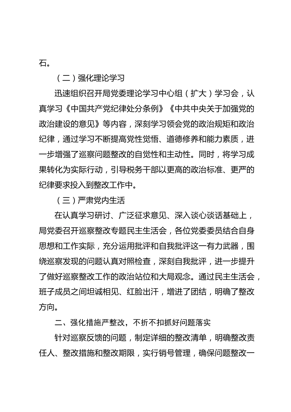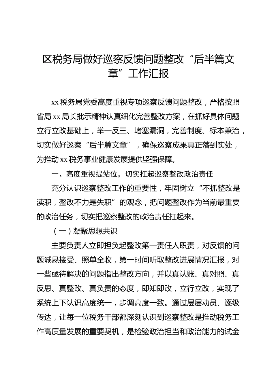 區(qū)稅務(wù)局做好巡察反饋問題整改“后半篇文章”工作匯報(bào)xx稅務(wù)局黨委高度重視專項(xiàng)巡察反饋問題整改,嚴(yán)格按照省局xx局長批示精神認(rèn)真細(xì)化完善整改方案,在抓好具體問題立行立改基礎(chǔ)上,舉一反三、堵塞漏洞,完善制度、標(biāo)本兼治,切實(shí)做好巡察“后半篇文章”,確保巡察成果真正落到實(shí)處,為推動(dòng)xx稅務(wù)事業(yè)健康發(fā)展提供堅(jiān)強(qiáng)保障。一、高度重視提站位,切實(shí)扛起巡察整改政治責(zé)任充分認(rèn)識(shí)巡察整改工作的重要性,牢固樹立“不抓整改是瀆職,整改不力是失職”的觀念,把問題整改作為當(dāng)前最重要的政治任務(wù),切實(shí)把巡察整改的政治責(zé)任扛起來。(一)凝聚思想共識(shí)主要負(fù)責(zé)人立即擔(dān)負(fù)...