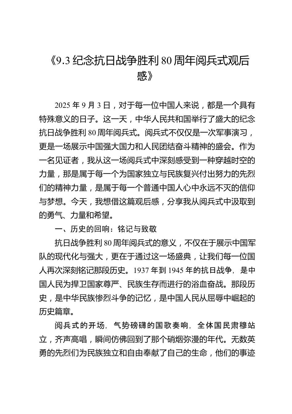 《9.3紀(jì)念抗日戰(zhàn)爭勝利80周年閱兵式觀后感》2025年9月3日,對于每一位中國人來說,都是一個具有特殊意義的日子。這一天,中華人民共和國舉行了盛大的紀(jì)念抗日戰(zhàn)爭勝利80周年閱兵式。閱兵式不僅僅是一次軍事演習(xí),更是一場展示中國強大國力和人民團結(jié)奮斗精神的盛會。作為一名見證者,我從這一場閱兵式中深刻感受到一種穿越時空的力量,那是屬于每一個為國家獨立與民族復(fù)興付出努力的先烈們的精神力量,是屬于每一個普通中國人心中永遠不滅的信仰與夢想。今天,我想借這篇觀后感,分享我從閱兵式中汲取到的勇氣、力量和希望。一、歷史的回響:銘記與致敬抗日戰(zhàn)爭勝利80周...