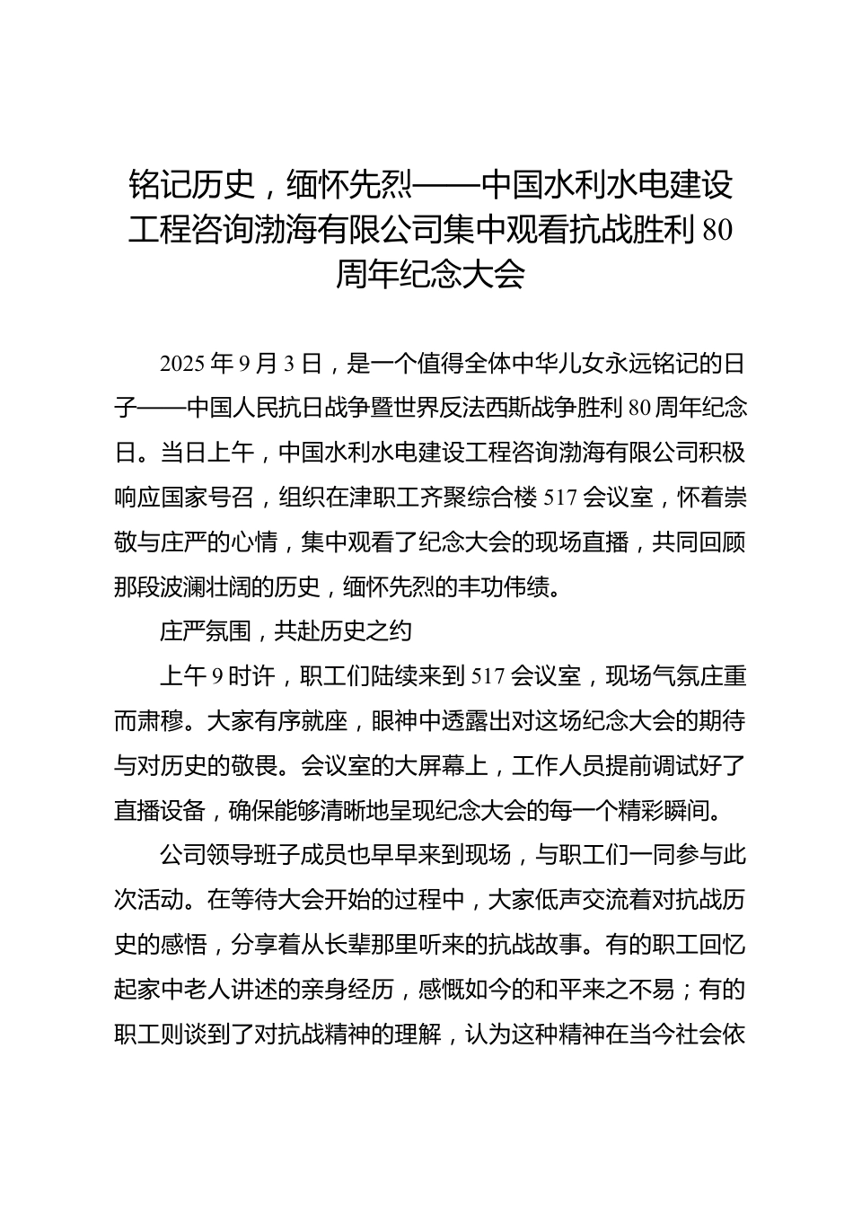 銘記歷史,緬懷先烈——中國水利水電建設工程咨詢渤海有限公司集中觀看抗戰(zhàn)勝利80周年紀念大會