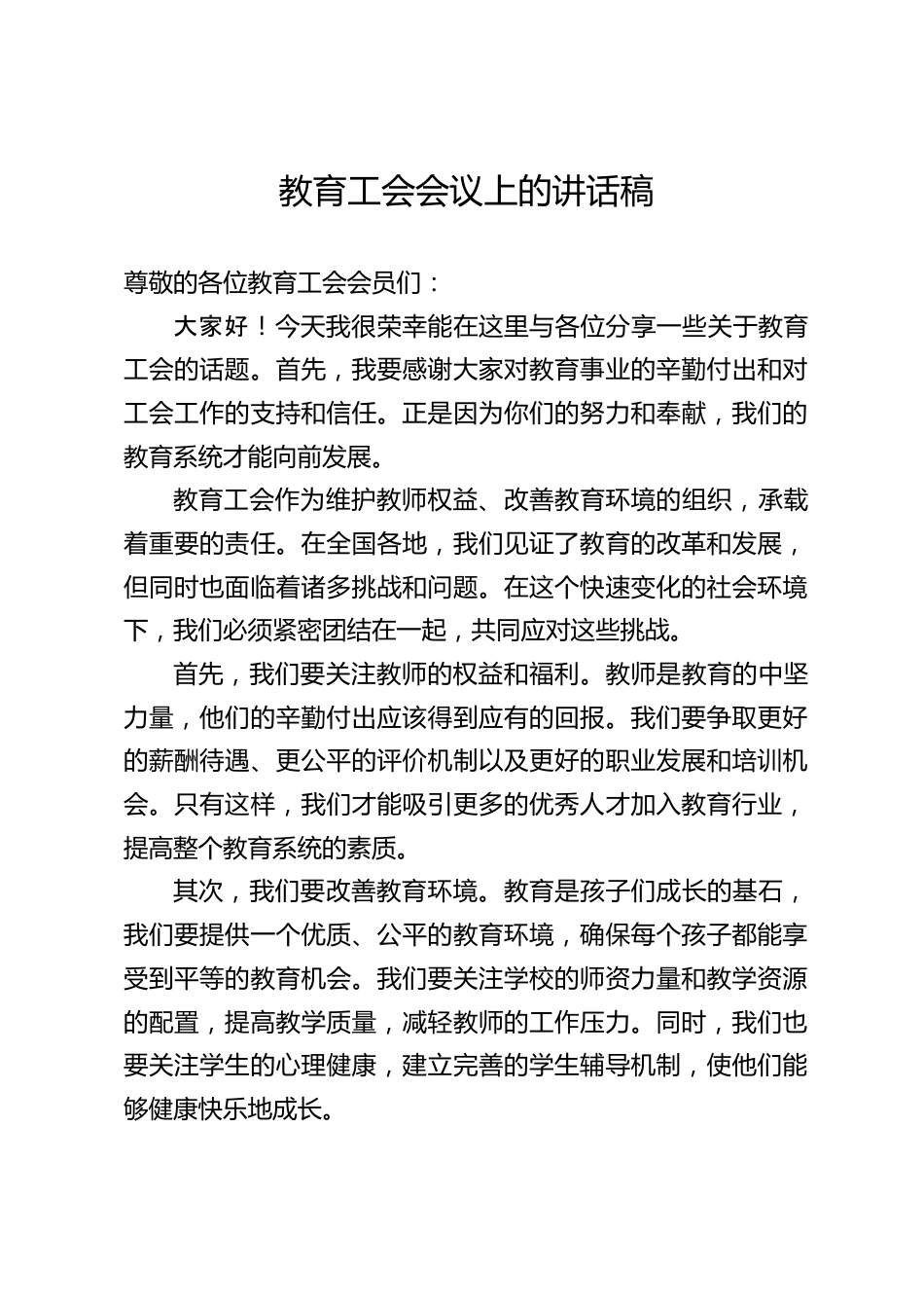 教育工會會議上的講話稿尊敬的各位教育工會會員們:大家好!今天我很榮幸能在這里與各位分享一些關(guān)于教育工會的話題。首先,我要感謝大家對教育事業(yè)的辛勤付出和對工會工作的支持和信任。正是因為你們的努力和奉獻(xiàn),我們的教育系統(tǒng)才能向前發(fā)展。教育工會作為維護(hù)教師權(quán)益、改善教育環(huán)境的組織,承載著重要的責(zé)任。在全國各地,我們見證了教育的改革和發(fā)展,但同時也面臨著諸多挑戰(zhàn)和問題。在這個快速變化的社會環(huán)境下,我們必須緊密團(tuán)結(jié)在一起,共同應(yīng)對這些挑戰(zhàn)。首先,我們要關(guān)注教師的權(quán)益和福利。教師是教育的中堅力量,他們的辛勤付出應(yīng)該得到應(yīng)有的回報。我們要爭...