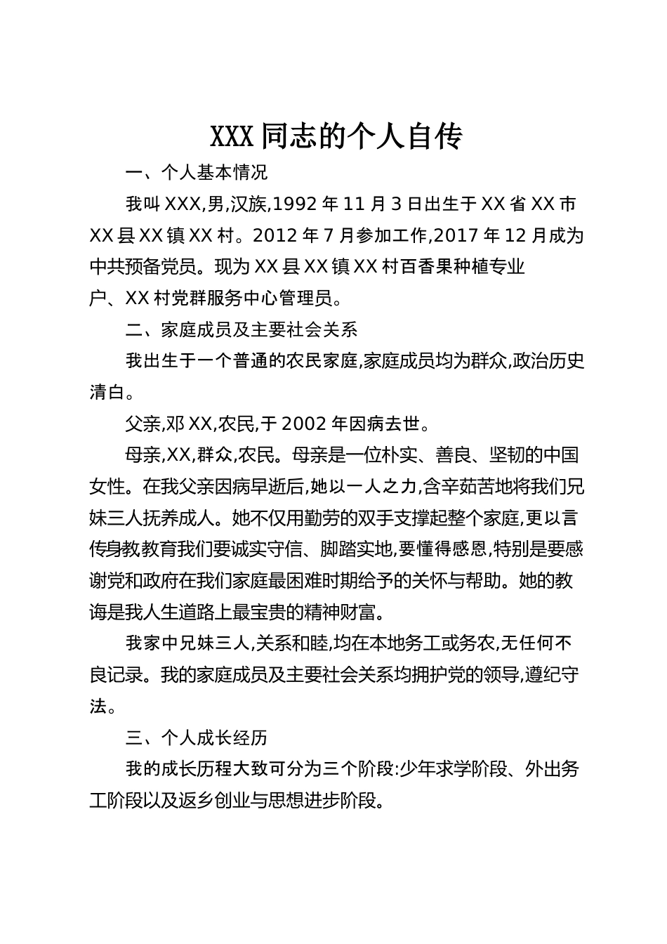 XXX同志的個(gè)人自傳一、個(gè)人基本情況我叫XXX,男,漢族,1992年11月3日出生于XX省XX市XX縣XX鎮(zhèn)XX村。2012年7月參加工作,2017年12月成為中共預(yù)備黨員。現(xiàn)為XX縣XX鎮(zhèn)XX村百香果種植專業(yè)戶、XX村黨群服中心管理。務(wù)員二、家庭成員及主要社會(huì)關(guān)系我出生于一個(gè)普通的農(nóng)民家庭,家庭成員均為群眾,政治歷史清白。父親,鄧XX,農(nóng)民,于2002年因病去世。母親,XX,群眾,農(nóng)民。母親是一位樸實(shí)、善良、堅(jiān)韌的中國女性。在我父親因病早逝后,她以一人之力,含辛茹苦地將我們兄妹三人撫養(yǎng)成人。她不僅用勤勞的雙手支撐起整個(gè)家庭,更以言傳身教,教育我們要誠實(shí)守信、腳踏實(shí)地,要懂得感恩,特別是要感...