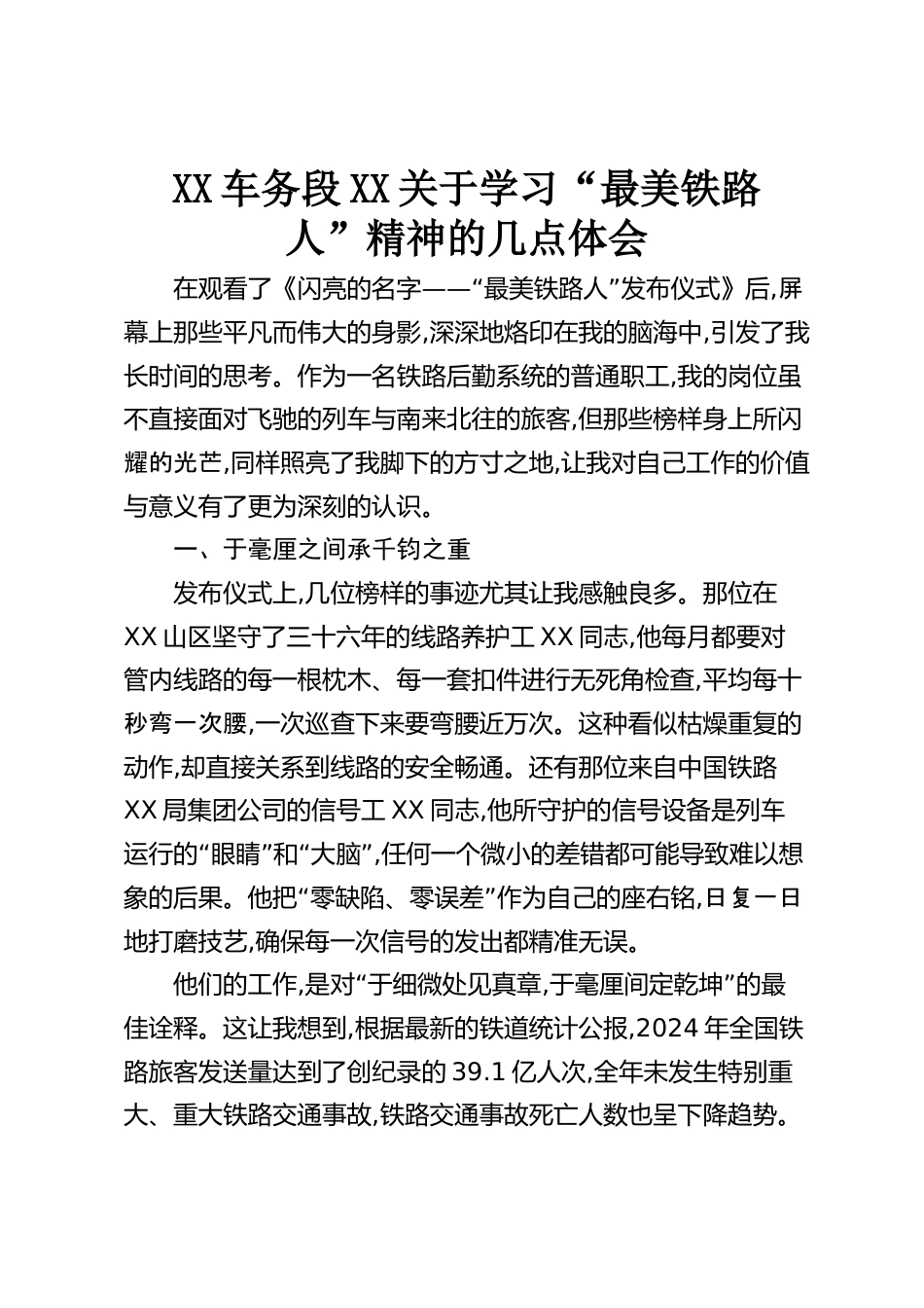 XX車務(wù)段XX關(guān)于學(xué)習(xí)“最美鐵路人”精神的幾點(diǎn)體會