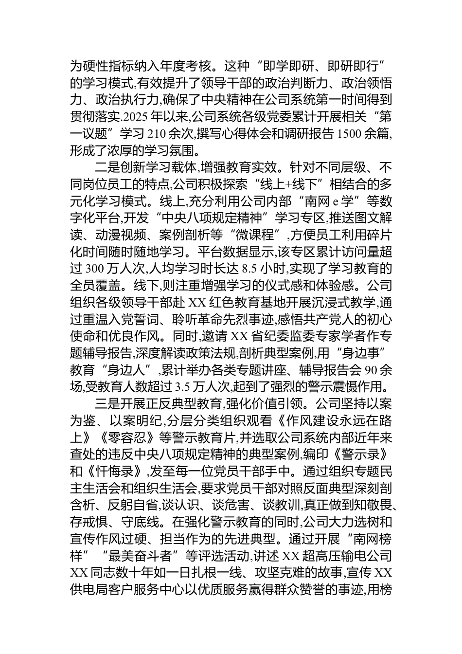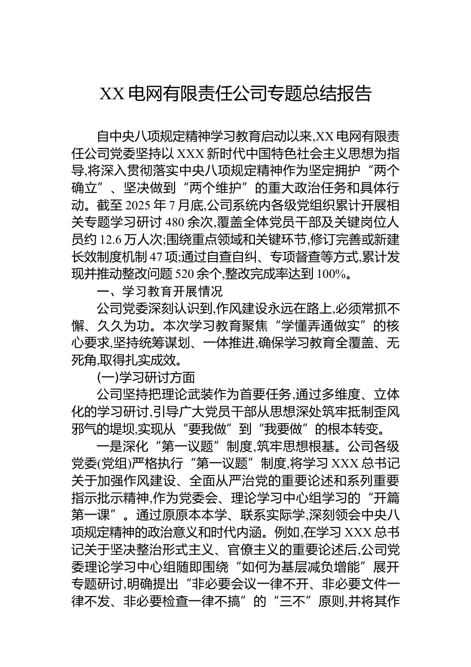 XX電網(wǎng)有限責(zé)任公司專題總結(jié)報(bào)告自中央八項(xiàng)規(guī)定精神學(xué)習(xí)教育啟動(dòng)以來,XX電網(wǎng)有限責(zé)任公司黨委堅(jiān)持以XXX新時(shí)代中國特色社會(huì)主義思想為指導(dǎo),將深入貫徹落實(shí)中央八項(xiàng)規(guī)定精神作為堅(jiān)定擁護(hù)“兩個(gè)確立”、堅(jiān)決做到“兩個(gè)維護(hù)”的重大政治任務(wù)和具體行動(dòng)。截至2025年7月底,公司系統(tǒng)內(nèi)各級黨組織累計(jì)開展相關(guān)專題學(xué)習(xí)研討480余次,覆蓋全體黨員干部及關(guān)鍵崗位人員約12.6萬人次;圍繞重點(diǎn)領(lǐng)域和關(guān)鍵環(huán)節(jié),修訂完善或新建長效制度機(jī)制47項(xiàng);通過自查自糾、專項(xiàng)督查等方式,累計(jì)發(fā)現(xiàn)并推動(dòng)整改問題520余個(gè),整改完成率達(dá)到100%。一、學(xué)習(xí)教育開展情況公司黨委深刻認(rèn)識到,作風(fēng)建設(shè)永遠(yuǎn)在路...