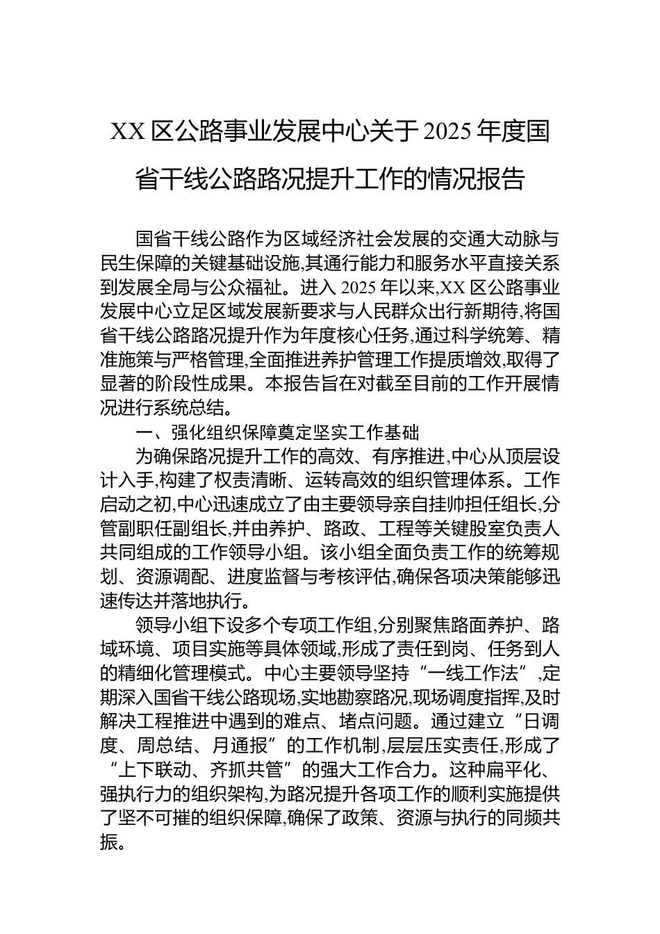 XX區(qū)公路事業(yè)發(fā)展中心關于2025年度國省干線公路路況提升工作的情況報告