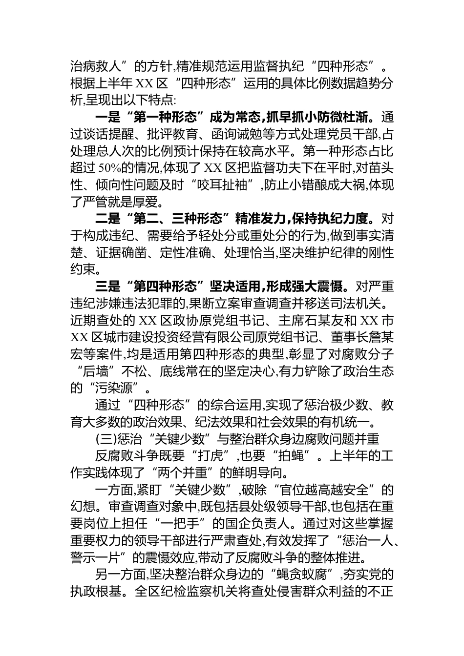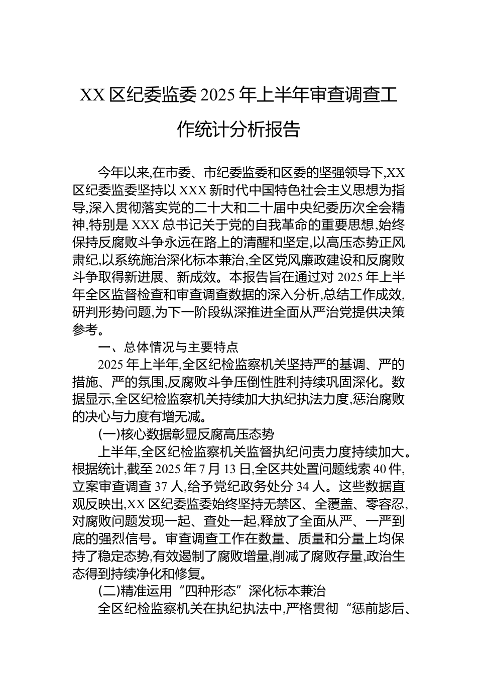 XX區(qū)紀(jì)委監(jiān)委2025年上半年審查調(diào)查工作統(tǒng)計分析報告今年以來,在市委、市紀(jì)委監(jiān)委和區(qū)委的堅強領(lǐng)導(dǎo)下,XX區(qū)紀(jì)委監(jiān)委堅持以XXX新時代中國特色社會主義思想為指導(dǎo),深入貫徹落實黨的二十大和二十屆中央紀(jì)委歷次全會精神,特別是XXX總書記關(guān)于黨的自我革命的重要思想,始終保持反腐敗斗爭永遠(yuǎn)在路上的清醒和堅定,以高壓態(tài)勢正風(fēng)肅紀(jì),以系統(tǒng)施治深化標(biāo)本兼治,全區(qū)黨風(fēng)廉政建設(shè)和反腐敗斗爭取得新進(jìn)展、新成效。本報告旨在通過對2025年上半年全區(qū)監(jiān)督檢查和審查調(diào)查數(shù)據(jù)的深入分析,總結(jié)工作成效,研判形勢問題,為下一階段縱深推進(jìn)全面從嚴(yán)治黨提供決策參考。一、總體情況與主要特點2...