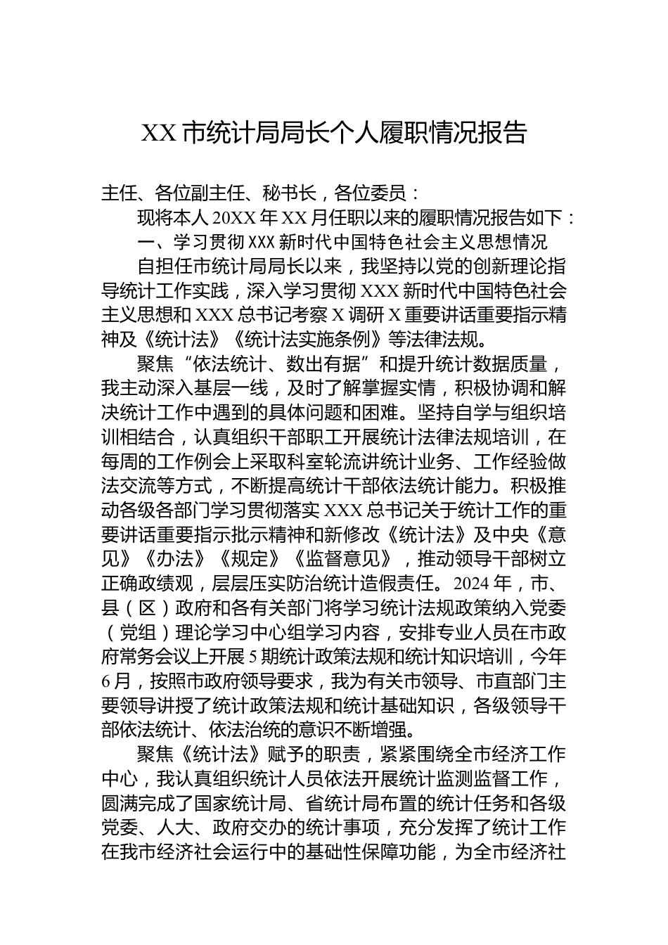 XX市統(tǒng)計局局長個人履職情況報告主任、各位副主任、秘書長,各位委員:現(xiàn)將本人20XX年XX月任職以來的履職情況報告如下:一、學(xué)習(xí)貫徹XXX新時代中國特色社會主義思想情況自擔(dān)任市統(tǒng)計局局長以來,我堅持以黨的創(chuàng)新理論指導(dǎo)統(tǒng)計工作實踐,深入學(xué)習(xí)貫徹XXX新時代中國特色社會主義思想和XXX總書記考察X調(diào)研X重要講話重要指示精神及《統(tǒng)計法》《統(tǒng)計法實施條例》等法律法規(guī)。聚焦“依法統(tǒng)計、數(shù)出有據(jù)”和提升統(tǒng)計數(shù)據(jù)質(zhì)量,我主動深入基層一線,及時了解掌握實情,積極協(xié)調(diào)和解決統(tǒng)計工作中遇到的具體問題和困難。堅持自學(xué)與組織培訓(xùn)相結(jié)合,認(rèn)真組織干部職工開展統(tǒng)計法律法...