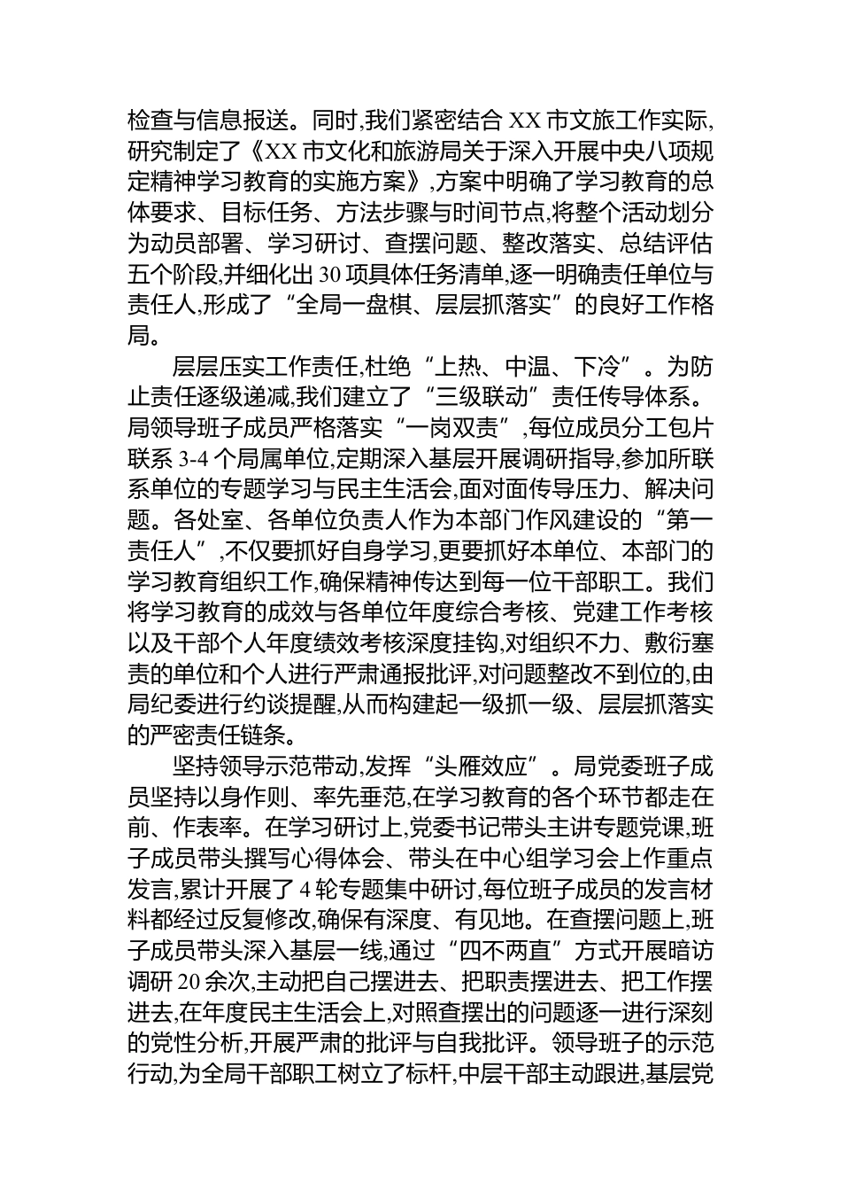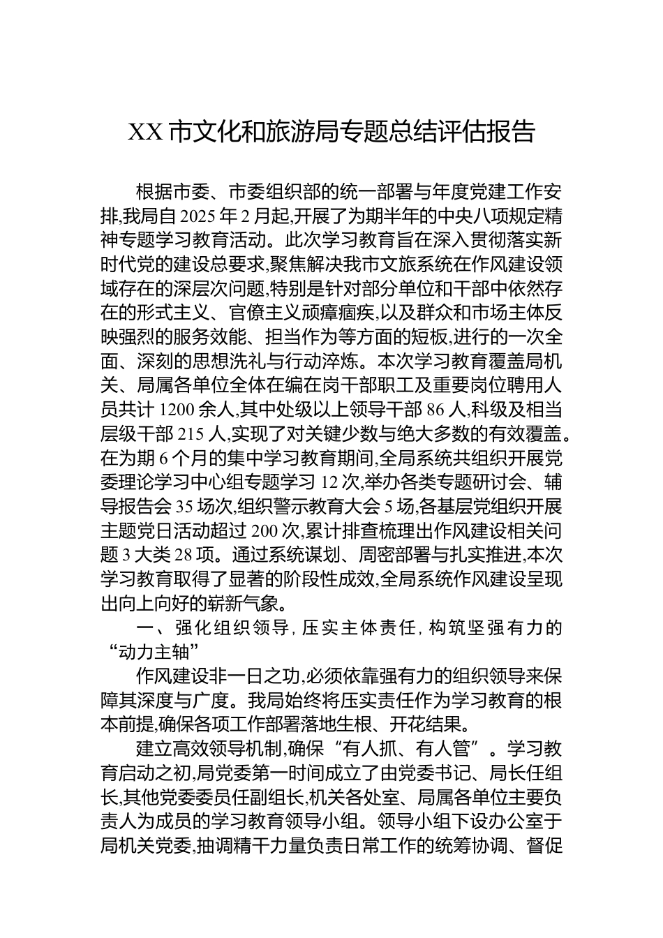 XX市文化和旅游局專題總結評估報告根據市委、市委組織部的統(tǒng)一部署與年度黨建工作安排,我局自2025年2月起,開展了為期半年的中央八項規(guī)定精神專題學習教育活動。此次學習教育旨在深入貫徹落實新時代黨的建設總要求,聚焦解決我市文旅系統(tǒng)在作風建設領域存在的深層次問題,特別是針對部分單位和干部中依然存在的形式主義、官僚主義頑瘴痼疾,以及群眾和市場主體反映強烈的服務效能、擔當作為等方面的短板,進行的一次全面、深刻的思想洗禮與行動淬煉。本次學習教育覆蓋局機關、局屬各單位全體在編在崗干部職工及重要崗位聘用人員共計1200余人,其中處級以上領導干部86人,科級及...