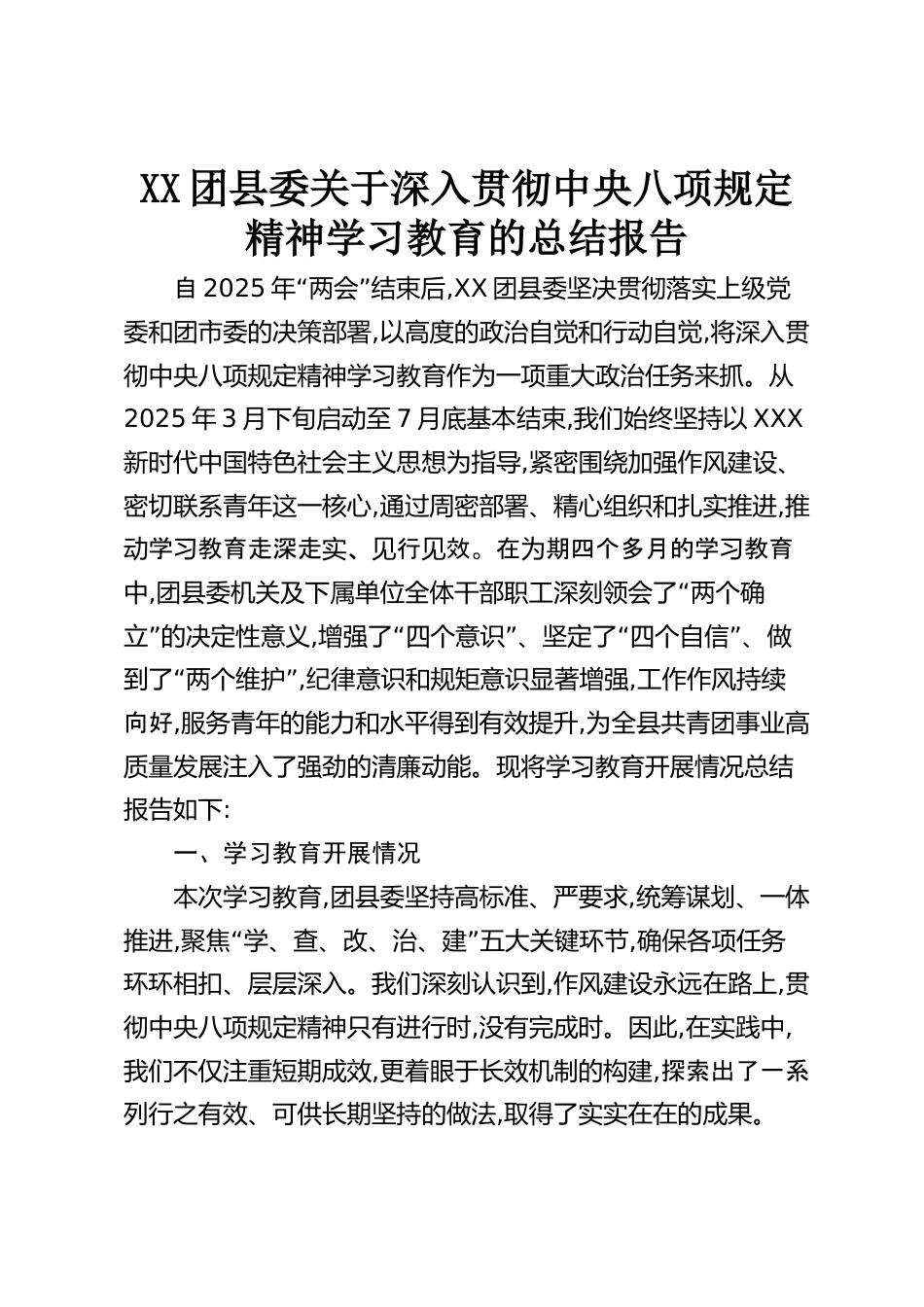 XX團(tuán)縣委關(guān)于深入貫徹中央八項(xiàng)規(guī)定精神學(xué)習(xí)教育的總結(jié)報(bào)告