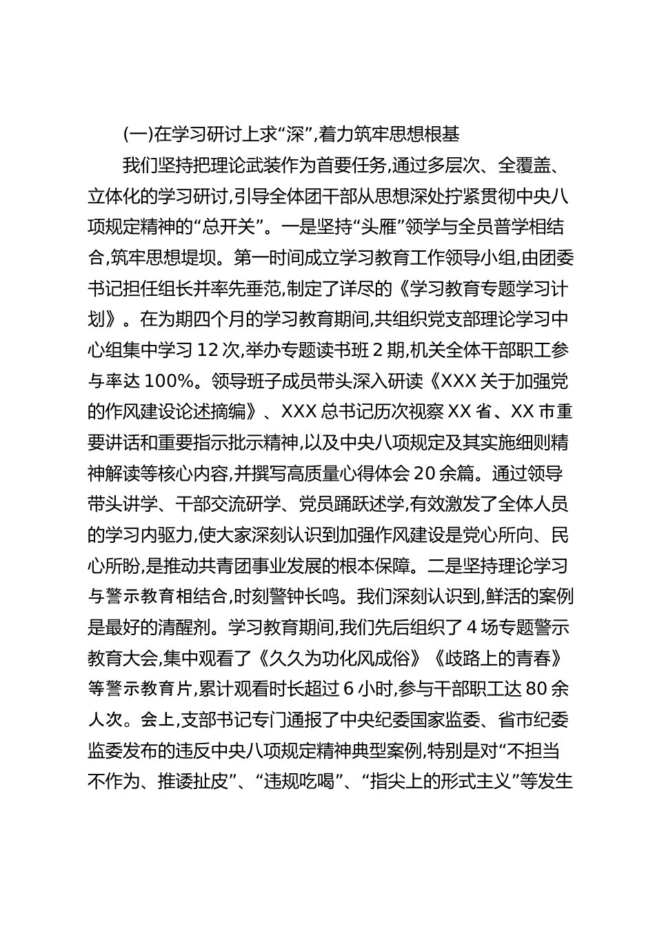 XX團(tuán)縣委關(guān)于深入貫徹中央八項(xiàng)規(guī)定精神學(xué)習(xí)教育的總結(jié)報(bào)告自2025“”年兩會(huì)結(jié)束后,XX團(tuán)縣委堅(jiān)決貫徹落實(shí)上級(jí)黨委和團(tuán)市委的決策部署,以高度的政治自覺(jué)和行動(dòng)自覺(jué),將深入貫徹中央八項(xiàng)規(guī)定精神學(xué)習(xí)教育作為一項(xiàng)重大政治任務(wù)來(lái)抓。從2025年3月下旬啟動(dòng)至7月底基本結(jié)束,我們始終堅(jiān)持以XXX新時(shí)代中國(guó)特色社會(huì)主義思想為指導(dǎo),緊密圍繞加強(qiáng)作風(fēng)建設(shè)、密切聯(lián)系青年這一核心,通過(guò)周密部署、精心組織和扎實(shí)推進(jìn),推學(xué)教育走深走、行效。在期四個(gè)多月的學(xué)教育動(dòng)習(xí)實(shí)見(jiàn)見(jiàn)為習(xí)中,“團(tuán)縣委機(jī)關(guān)及下屬單位全體干部職工深刻領(lǐng)會(huì)了兩個(gè)確”立的決定性意義,“”“”增強(qiáng)了四個(gè)意識(shí)、堅(jiān)定了四...