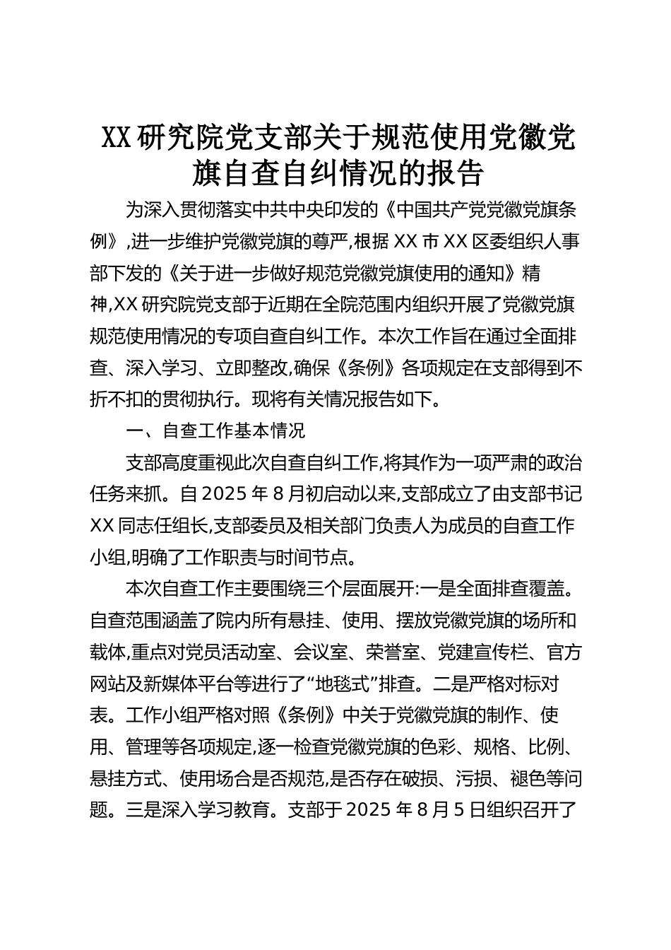XX研究院黨支部關(guān)于規(guī)范使用黨徽黨旗自查自糾情況的報(bào)告為深入貫徹落實(shí)中共中央印發(fā)的《中國(guó)共產(chǎn)黨黨徽黨旗條例》,進(jìn)一步維護(hù)黨徽黨旗的尊嚴(yán),根據(jù)XX市XX區(qū)委組織人事部下發(fā)的《關(guān)于進(jìn)一步做好規(guī)范黨徽黨旗使用的通知》精神,XX研究院黨支部于近期在全院范圍內(nèi)組織開展了黨徽黨旗規(guī)范使用情況的專項(xiàng)自查自糾工作。本次工作旨在通過全面排查、深入學(xué)習(xí)、立即整改,確?!稐l例》各項(xiàng)規(guī)定在支部得到不折不扣的貫徹執(zhí)行?,F(xiàn)將有關(guān)情況報(bào)告如下。一、自查工作基本情況支部高度重視此次自查自糾工作,將其作為一項(xiàng)嚴(yán)肅的政治任務(wù)來抓。自2025年8月初啟動(dòng)以來,支部成立了由支部書記X...