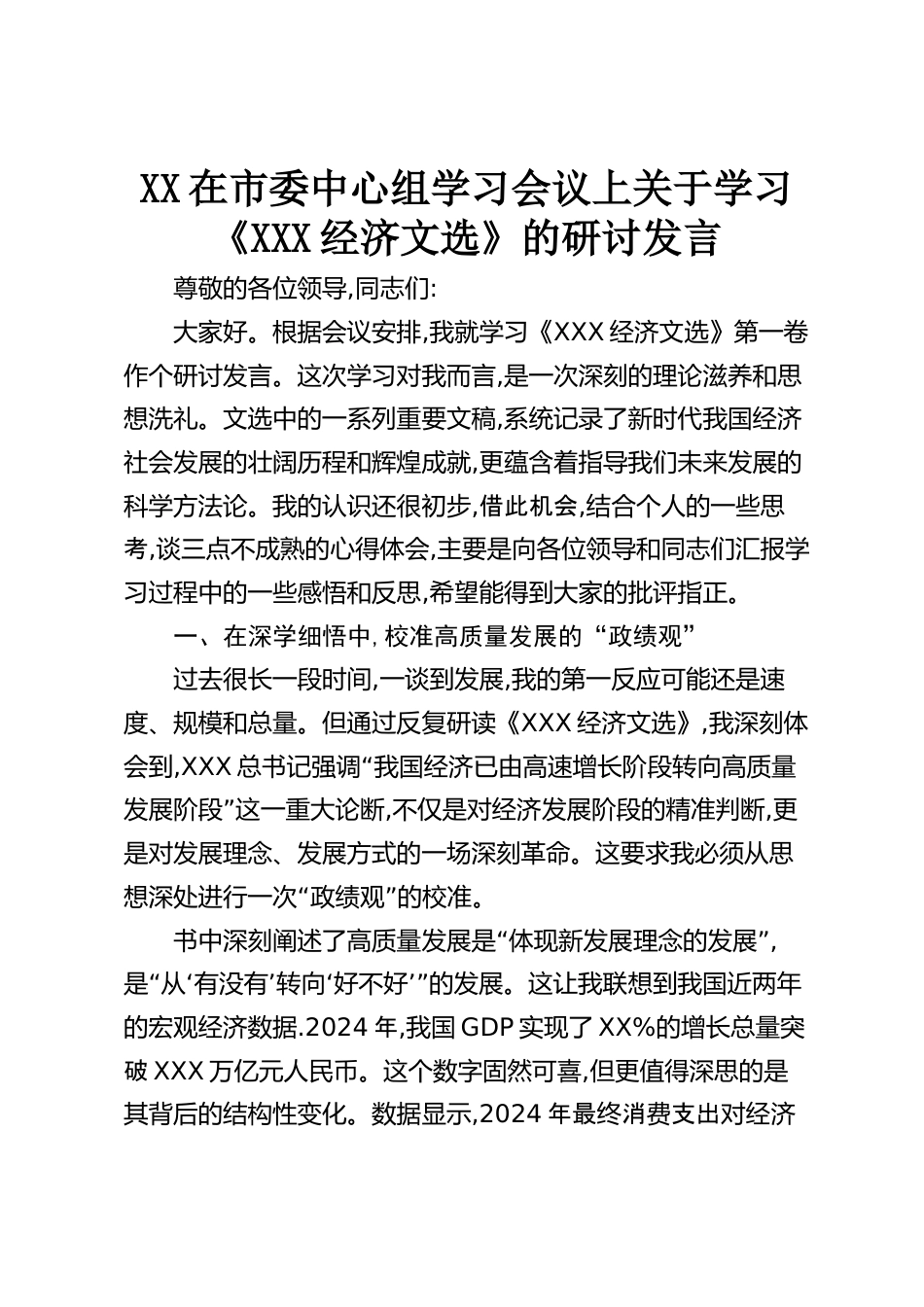 XX在市委中心組學(xué)習(xí)會議上關(guān)于學(xué)習(xí)《XXX經(jīng)濟(jì)文選》的研討發(fā)言尊敬的各位領(lǐng)導(dǎo),同志們:大家好。根據(jù)會議安排,我就學(xué)習(xí)《XXX經(jīng)濟(jì)文選》第一卷作個(gè)研討發(fā)言。這次學(xué)習(xí)對我而言,是一次深刻的理論滋養(yǎng)和思想洗禮。文選中的一系列重要文稿,系統(tǒng)記錄了新時(shí)代我國經(jīng)濟(jì)社會發(fā)展的壯闊歷程和輝煌成就,更蘊(yùn)含著指導(dǎo)我們未來發(fā)展的科學(xué)方法論。我的認(rèn)識還很初步,借此機(jī)會,結(jié)合個(gè)人的一些思考,談三點(diǎn)不成熟的心得體會,主要是向各位領(lǐng)導(dǎo)和同志們匯報(bào)學(xué)習(xí)過程中的一些感悟和反思,希望能得到大家的批評指正。一、在深學(xué)細(xì)悟中,校準(zhǔn)高質(zhì)量發(fā)展的“政績觀”過去很長一段時(shí)間,一談到發(fā)展,我的...