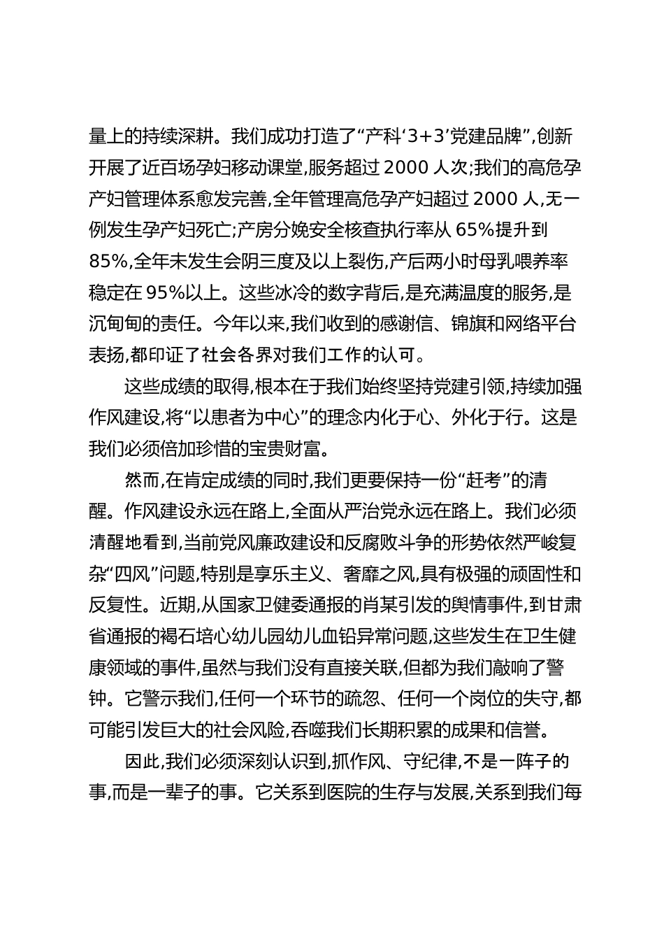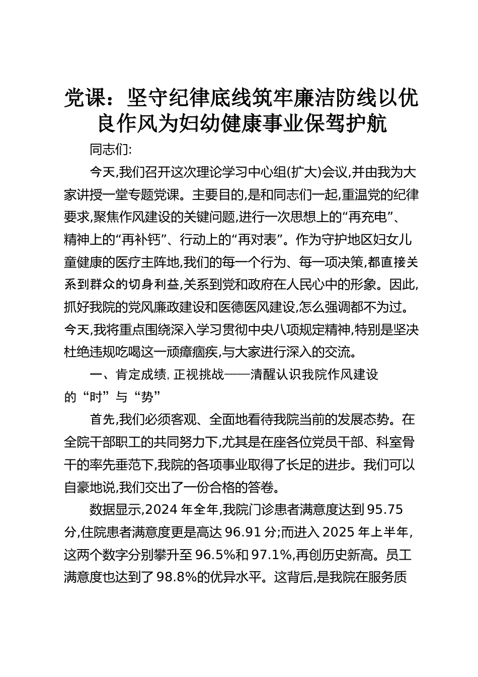 黨課:堅守紀(jì)律底線筑牢廉潔防線以優(yōu)良作風(fēng)為婦幼健康事業(yè)保駕護(hù)航同志們:今天,我們召開這次理論學(xué)習(xí)中心組(擴大)會議,并由我為大家講授一堂專題黨課。主要目的,是和同志們一起,重溫黨的紀(jì)律要求,聚焦作風(fēng)建設(shè)的關(guān)鍵問題,“”進(jìn)行一次思想上的再充電、“”“”精神上的再補鈣、行動上的再對表。作為守護(hù)地區(qū)婦女兒童健康的醫(yī)療主陣地,我們的每一個行為、每一項決策,都直接關(guān)系到群眾的切身利益,關(guān)系到黨和政府在人民心中的形象。因此,抓好我院的黨風(fēng)廉政建設(shè)和醫(yī)德醫(yī)風(fēng)建設(shè),怎么強調(diào)都不為過。今天,我將重點圍繞深入學(xué)習(xí)貫徹中央八項規(guī)定精神,特別是堅決杜絕違規(guī)吃喝這一...
