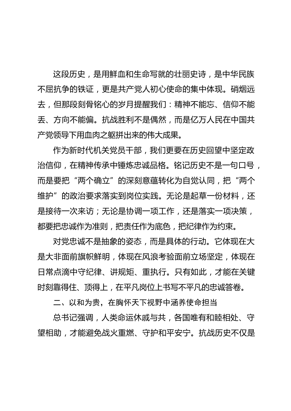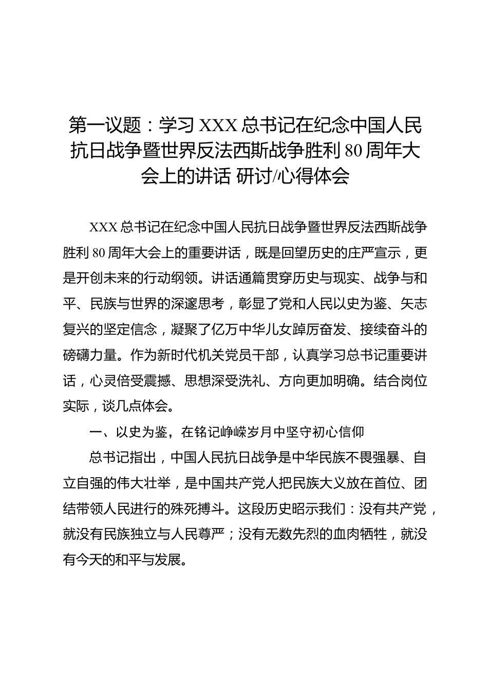 第一議題:學(xué)習(xí)XXX總書(shū)記在紀(jì)念中國(guó)人民抗日戰(zhàn)爭(zhēng)暨世界反法西斯戰(zhàn)爭(zhēng)勝利80周年大會(huì)上的講話研討/心得體會(huì)XXX總書(shū)記在紀(jì)念中國(guó)人民抗日戰(zhàn)爭(zhēng)暨世界反法西斯戰(zhàn)爭(zhēng)勝利80周年大會(huì)上的重要講話,既是回望歷史的莊嚴(yán)宣示,更是開(kāi)創(chuàng)未來(lái)的行動(dòng)綱領(lǐng)。講話通篇貫穿歷史與現(xiàn)實(shí)、戰(zhàn)爭(zhēng)與和平、民族與世界的深邃思考,彰顯了黨和人民以史為鑒、矢志復(fù)興的堅(jiān)定信念,凝聚了億萬(wàn)中華兒女踔厲奮發(fā)、接續(xù)奮斗的磅礴力量。作為新時(shí)代機(jī)關(guān)黨員干部,認(rèn)真學(xué)習(xí)總書(shū)記重要講話,心靈倍受震撼、思想深受洗禮、方向更加明確。結(jié)合崗位實(shí)際,談幾點(diǎn)體會(huì)。一、以史為鑒,在銘記崢嶸歲月中堅(jiān)守初心信...