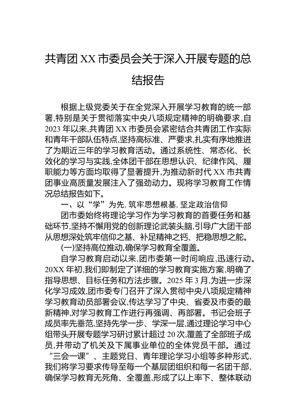 共青團XX市委員會關(guān)于深入開展專題的總結(jié)報告根據(jù)上級黨委關(guān)于在全黨深入開展學習教育的統(tǒng)一部署,特別是關(guān)于貫徹落實中央八項規(guī)定精神的明確要求,自2023年以來,共青團XX市委員會緊密結(jié)合共青團工作實際和青年干部隊伍特點,堅持高標準、嚴要求,扎實有序地推進了為期近三年的學習教育活動。通過系統(tǒng)性、常態(tài)化、長效化的學習與實踐,全體團干部在思想認識、紀律作風、履職能力等方面均取得了顯著提升,為推動新時代XX市共青團事業(yè)高質(zhì)量發(fā)展注入了強勁動力。現(xiàn)將學習教育工作情況總結(jié)報告如下。一、以“學”為先,筑牢思想根基,堅定政治信仰團市委始終將理論學習作為學習教育...