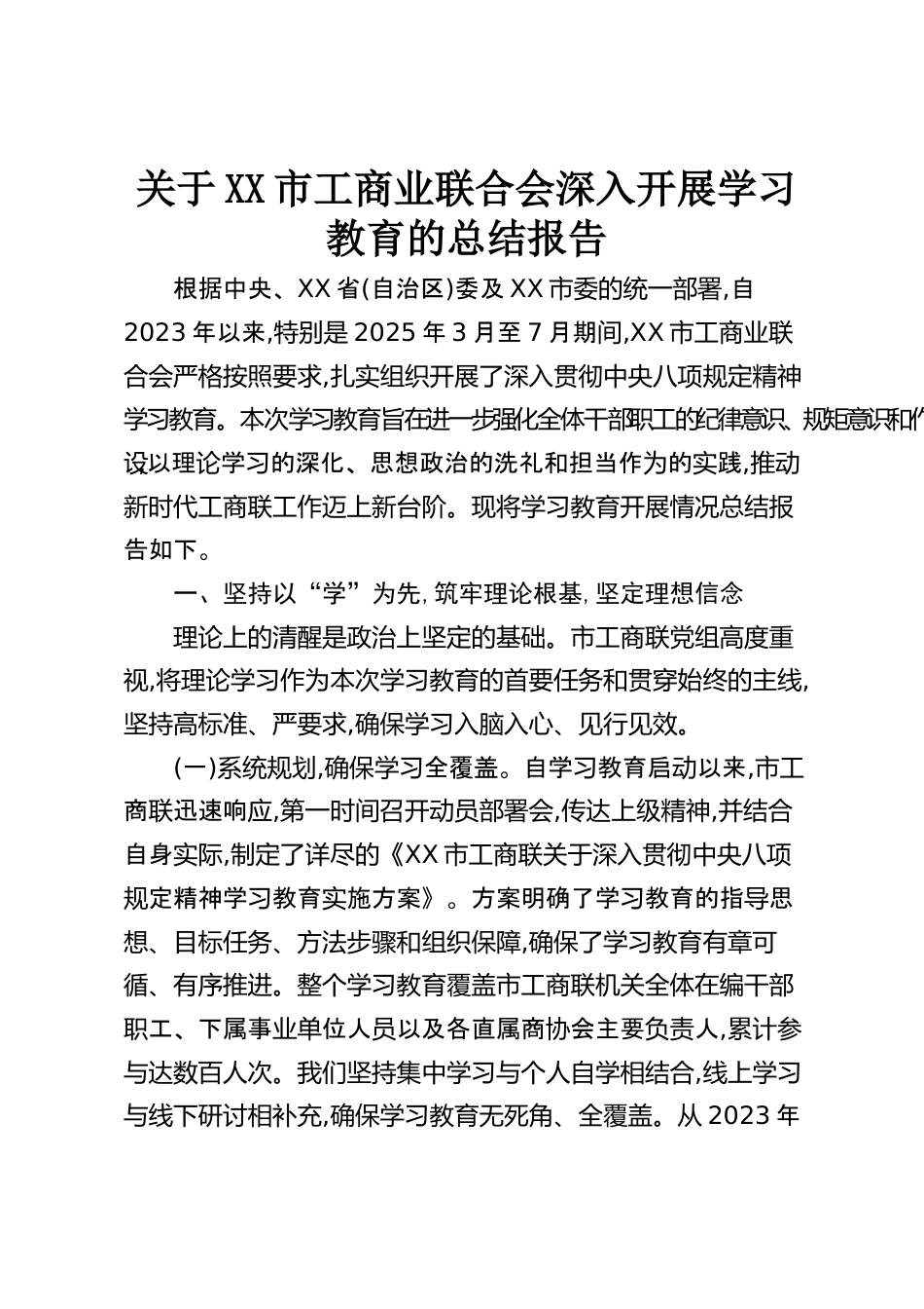 關(guān)于XX市工商業(yè)聯(lián)合會(huì)深入開(kāi)展學(xué)習(xí)教育的總結(jié)報(bào)告根據(jù)中央、XX省(自治區(qū))委及XX市委的統(tǒng)一部署,自2023年以來(lái),特別是2025年3月至7月期間,XX市工商業(yè)聯(lián)合會(huì)嚴(yán)格按照要求,扎實(shí)組織開(kāi)展了深入貫徹中央八項(xiàng)規(guī)定精神學(xué)習(xí)教育。本次學(xué)習(xí)教育旨在進(jìn)一步強(qiáng)化全體干部職工的紀(jì)律意識(shí)、規(guī)矩意識(shí)和作設(shè),以理學(xué)的深化、思想政治的洗禮和擔(dān)當(dāng)作的踐論習(xí)為實(shí),推動(dòng)新時(shí)代工商聯(lián)工作邁上新臺(tái)階。現(xiàn)將學(xué)習(xí)教育開(kāi)展情況總結(jié)報(bào)告如下。一、堅(jiān)持以“學(xué)”為先,筑牢理論根基,堅(jiān)定理想信念理論上的清醒是政治上堅(jiān)定的基礎(chǔ)。市工商聯(lián)黨組高度重視,將理論學(xué)習(xí)作為本次學(xué)習(xí)教育的首要任務(wù)和貫穿始終...