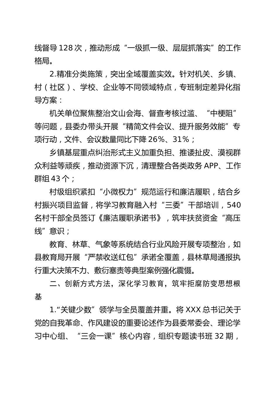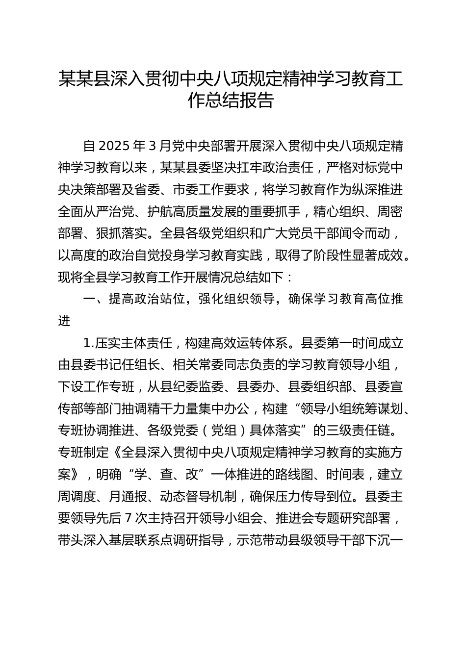 某某縣深入貫徹中央八項規(guī)定精神學(xué)習(xí)教育工作總結(jié)報告自2025年3月黨中央部署開展深入貫徹中央八項規(guī)定精神學(xué)習(xí)教育以來,某某縣委堅決扛牢政治責(zé)任,嚴(yán)格對標(biāo)黨中央決策部署及省委、市委工作要求,將學(xué)習(xí)教育作為縱深推進(jìn)全面從嚴(yán)治黨、護(hù)航高質(zhì)量發(fā)展的重要抓手,精心組織、周密部署、狠抓落實。全縣各級黨組織和廣大黨員干部聞令而動,以高度的政治自覺投身學(xué)習(xí)教育實踐,取得了階段性顯著成效?,F(xiàn)將全縣學(xué)習(xí)教育工作開展情況總結(jié)如下:一、提高政治站位,強(qiáng)化組織領(lǐng)導(dǎo),確保學(xué)習(xí)教育高位推進(jìn)1.壓實主體責(zé)任,構(gòu)建高效運(yùn)轉(zhuǎn)體系??h委第一時間成立由縣委書記任組長、相...