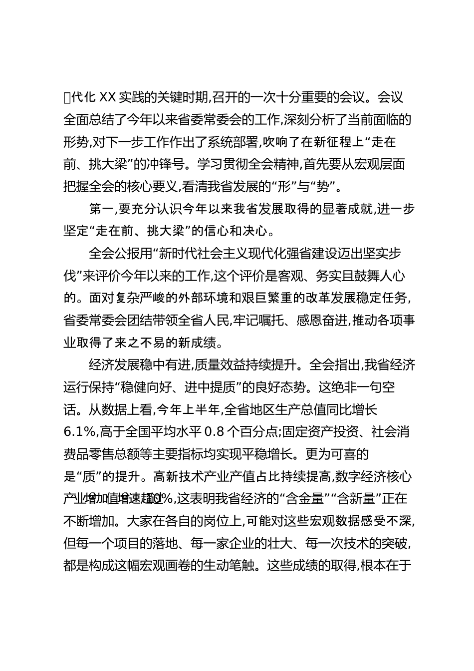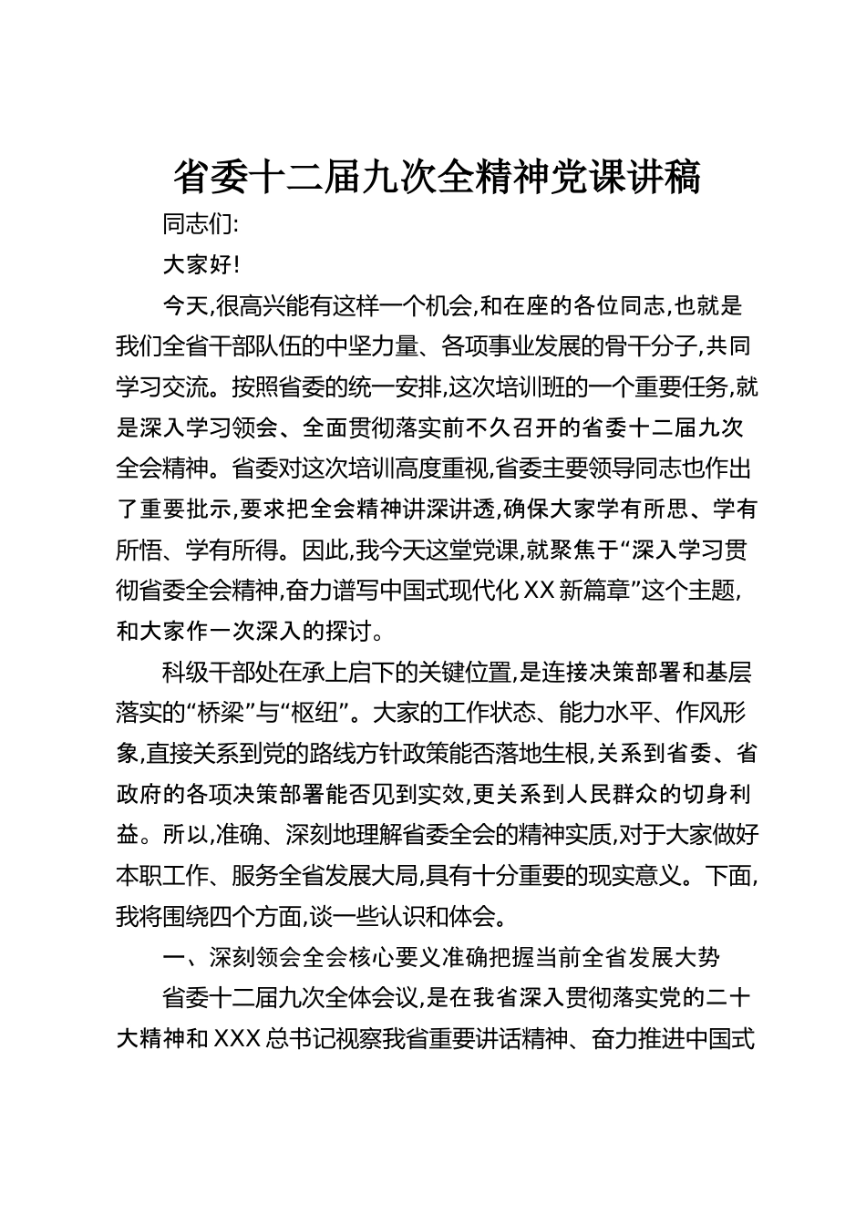 省委十二屆九次全精神黨課講稿同志們:大家好!今天,很高興能有這樣一個(gè)機(jī)會(huì),和在座的各位同志,也就是我們?nèi)「刹筷?duì)伍的中堅(jiān)力量、各項(xiàng)事業(yè)發(fā)展的骨干分子,共同學(xué)習(xí)交流。按照省委的統(tǒng)一安排,這次培訓(xùn)班的一個(gè)重要任務(wù),就是深入學(xué)會(huì)、全面落前不久召開(kāi)的省委十二屆九次習(xí)領(lǐng)貫徹實(shí)全會(huì)精神。省委對(duì)這次培訓(xùn)高度重視,省委主要領(lǐng)導(dǎo)同志也作出了重要批示,要求把全會(huì)精神深透講講,確保大家學(xué)有所思、學(xué)有所悟、學(xué)有所得。因此,我今天這堂黨課,“就聚焦于深入學(xué)習(xí)貫徹省委全會(huì)精神,奮力譜寫(xiě)中國(guó)式現(xiàn)代化XX”新篇章這個(gè)主題,和大家作一次深入的探。討科級(jí)干部處在承上啟下的關(guān)鍵...