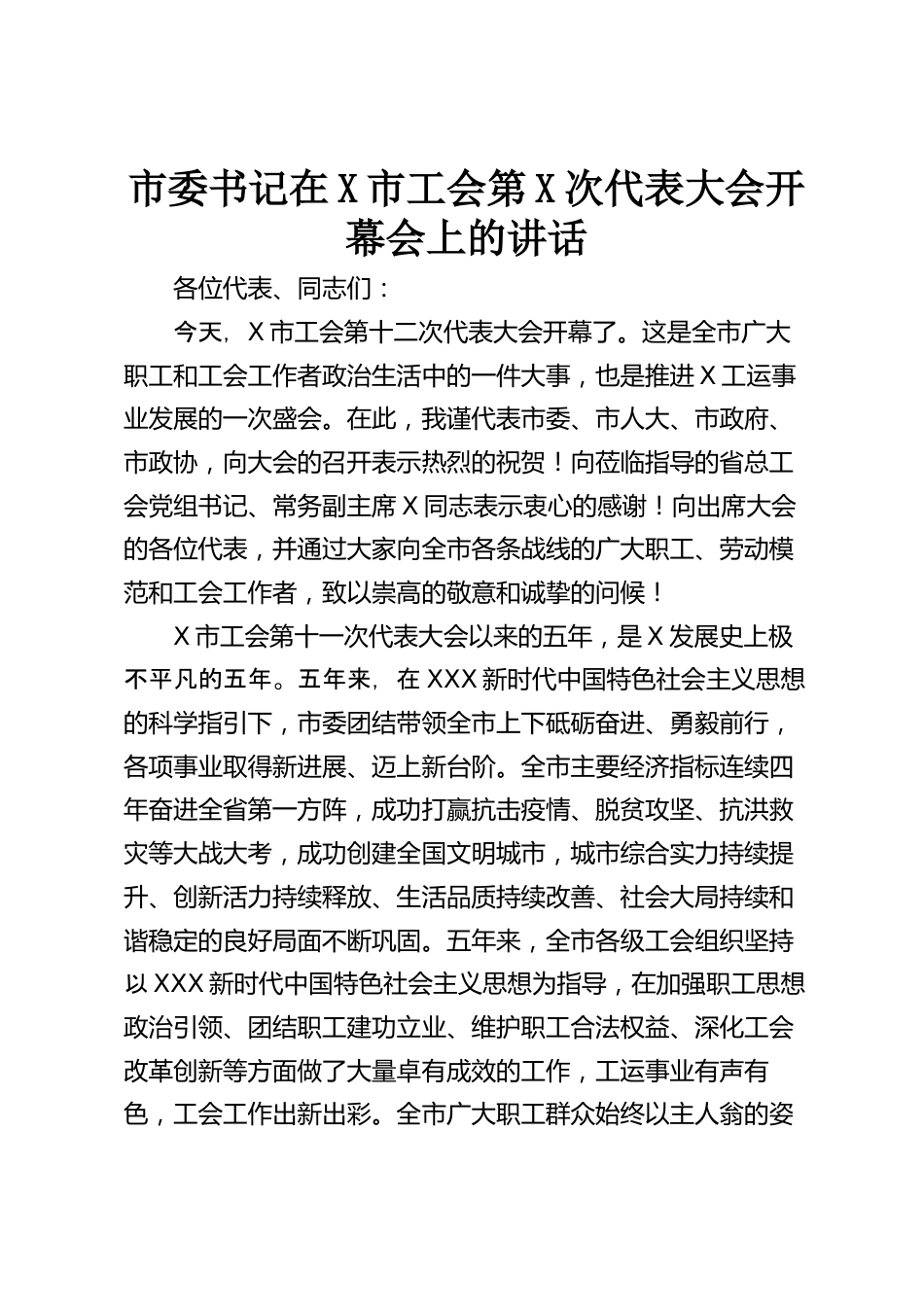 市委書記在X市工會第X次代表大會開幕會上的講話各位代表、同志們:今天,X市工會第十二次代表大會開幕了。這是全市廣大職工和工會工作者政治生活中的一件大事,也是推進X工運事業(yè)發(fā)展的一次盛會。在此,我謹代表市委、市人大、市政府、市政協(xié),向大會的召開表示熱烈的祝賀!向蒞臨指導(dǎo)的省總工會黨組書記、常務(wù)副主席X同志表示衷心的感謝!向出席大會的各位代表,并通過大家向全市各條戰(zhàn)線的廣大職工、勞動模范和工會工作者,致以崇高的敬意和誠摯的問候!X市工會第十一次代表大會以來的五年,是X發(fā)展史上極不平凡的五年。五年來,在XXX新時代中國特色社會主義思想的科學(xué)...