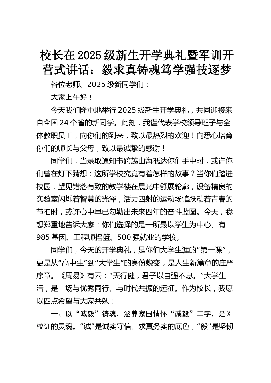 校長(zhǎng)在2025級(jí)新生開(kāi)學(xué)典禮暨軍訓(xùn)開(kāi)營(yíng)式講話:毅求真鑄魂篤學(xué)強(qiáng)技逐夢(mèng)各位老師、2025級(jí)新同學(xué)們:大家上午好!今天我們隆重地舉行2025級(jí)新生開(kāi)學(xué)典禮,共同迎接來(lái)自全國(guó)24個(gè)省的新同學(xué)。此刻,我謹(jǐn)代表學(xué)校領(lǐng)導(dǎo)班子與全體教職員工,向你們的到來(lái),致以最熱烈的歡迎!向悉心培育你們的師長(zhǎng)與父母,致以最誠(chéng)摯的感謝!同學(xué)們,當(dāng)錄取通知書(shū)跨越山海抵達(dá)你們手中時(shí),或許你們?cè)跓粝虏孪耄哼@所學(xué)校究竟有著怎樣的故事?當(dāng)你們踏進(jìn)校園,望見(jiàn)錯(cuò)落有致的教學(xué)樓在晨光中舒展輪廓,設(shè)備精良的實(shí)驗(yàn)室閃爍著智慧的光澤,活力四射的運(yùn)動(dòng)場(chǎng)館躍動(dòng)著青春的節(jié)拍時(shí),或許心中早已勾勒出...