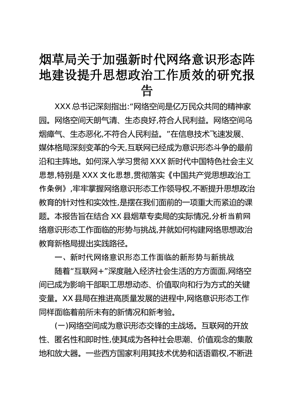 煙草局關(guān)于加強(qiáng)新時(shí)代網(wǎng)絡(luò)意識(shí)形態(tài)陣地建設(shè)提升思想政治工作質(zhì)效的研究報(bào)告XXX總書(shū)記深刻指出:“網(wǎng)絡(luò)空間是億萬(wàn)民眾共同的精神家園。網(wǎng)絡(luò)空間天朗氣清、生態(tài)良好,符合人民利益。網(wǎng)絡(luò)空間烏煙瘴氣、生態(tài)惡化,”不符合人民利益。在信息技術(shù)飛速發(fā)展、媒體格局深刻變革的今天,互聯(lián)網(wǎng)已經(jīng)成為意識(shí)形態(tài)斗爭(zhēng)的最前沿和主陣地。如何深入學(xué)習(xí)貫徹XXX新時(shí)代中國(guó)特色社會(huì)主義思想,特別是XXX文化思想,貫徹落實(shí)《中國(guó)共產(chǎn)黨思想政治工作條例》,牢牢掌握網(wǎng)絡(luò)意識(shí)形態(tài)工作領(lǐng)導(dǎo)權(quán),不斷提升思想政治教育的針對(duì)性和實(shí)效性,是擺在我們面前的一項(xiàng)重大而緊迫的課題。本報(bào)告旨在結(jié)合XX縣煙草專(zhuān)...