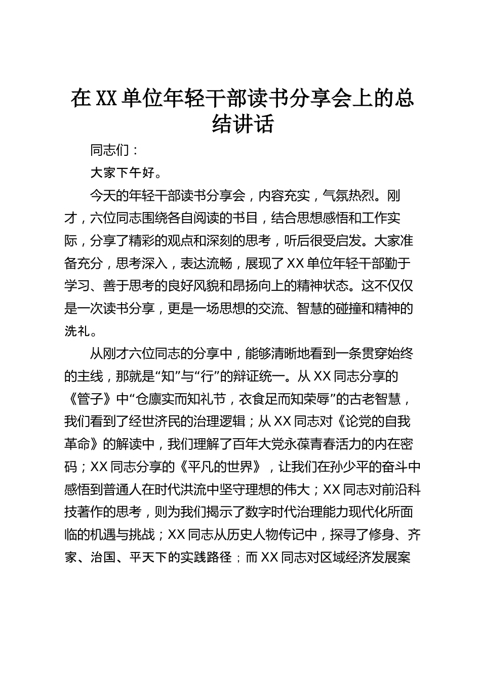 在XX單位年輕干部讀書分享會上的總結講話同志們:大家下午好。今天的年輕干部讀書分享會,內(nèi)容充實,氣氛熱烈。剛才,六位同志圍繞各自閱讀的書目,結合思想感悟和工作實際,分享了精彩的觀點和深刻的思考,聽后很受啟發(fā)。大家準備充分,思考深入,表達流暢,展現(xiàn)了XX單位年輕干部勤于學習、善于思考的良好風貌和昂揚向上的精神狀態(tài)。這不僅僅是一次讀書分享,更是一場思想的交流、智慧的碰撞和精神的洗禮。從剛才六位同志的分享中,能夠清晰地看到一條貫穿始終“”“”的主線,那就是知與行的辯證統(tǒng)一。從XX同志分享的“”《管子》中倉廩實而知禮節(jié),衣食足而知榮辱的古...