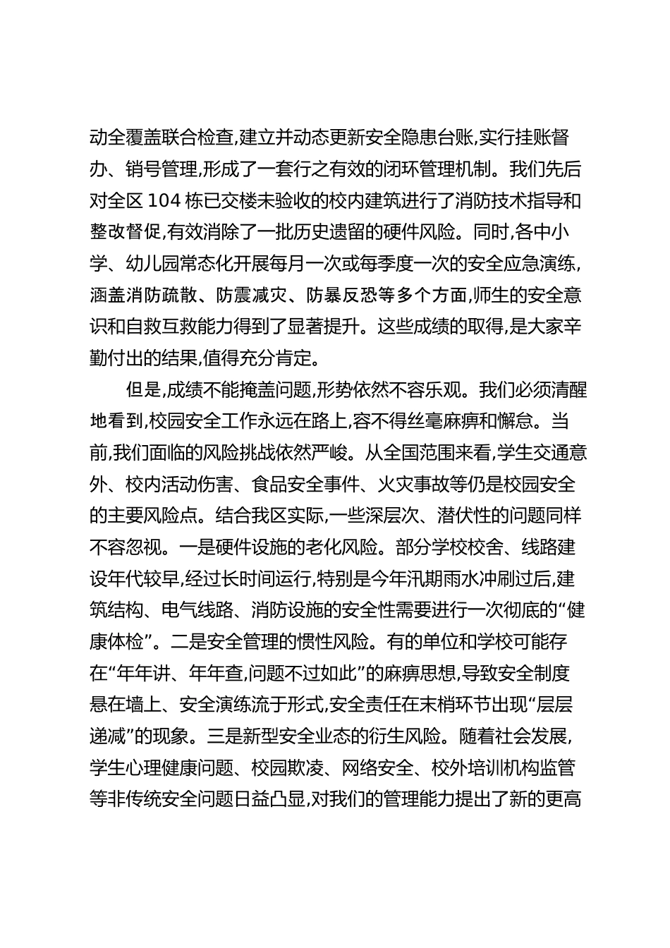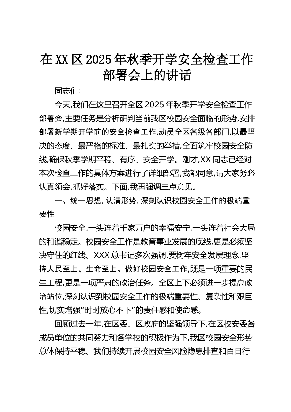 在XX區(qū)2025年秋季開學(xué)安全檢查工作部署會上的講話同志們:今天,我們在這里召開全區(qū)2025年秋季開學(xué)安全檢查工作部署會,主要任務(wù)是分析研判當(dāng)前我區(qū)校園安全面臨的形勢,安排部署新學(xué)期開學(xué)前的安全檢查工作,動員全區(qū)各級各部門,以最堅決的態(tài)度、最嚴(yán)格的標(biāo)準(zhǔn)、最扎實的舉措,全面筑牢校園安全防線,確保秋季學(xué)期平穩(wěn)、有序、安全開學(xué)。剛才,XX同志已經(jīng)對本次檢查工作的具體方案進(jìn)行了詳細(xì)部署,我都同意,請大家務(wù)必認(rèn)真領(lǐng)會,抓好落實。下面,我再強調(diào)三點意見。一、統(tǒng)一思想,認(rèn)清形勢,深刻認(rèn)識校園安全工作的極端重要性校園安全,一頭連著千家萬戶的幸福安寧,一頭連著社會大局的...