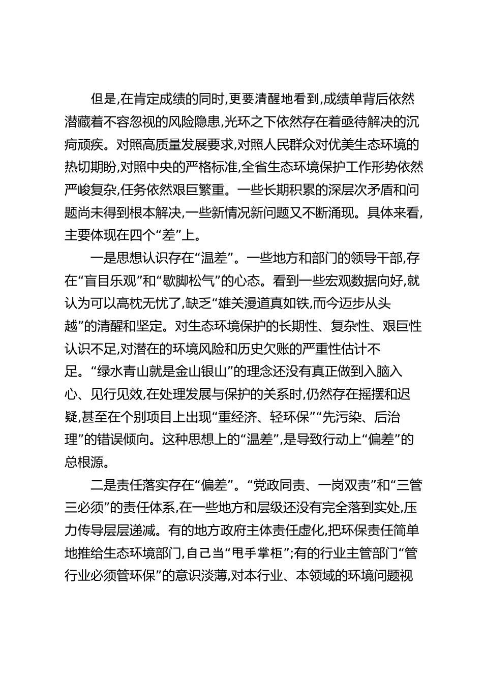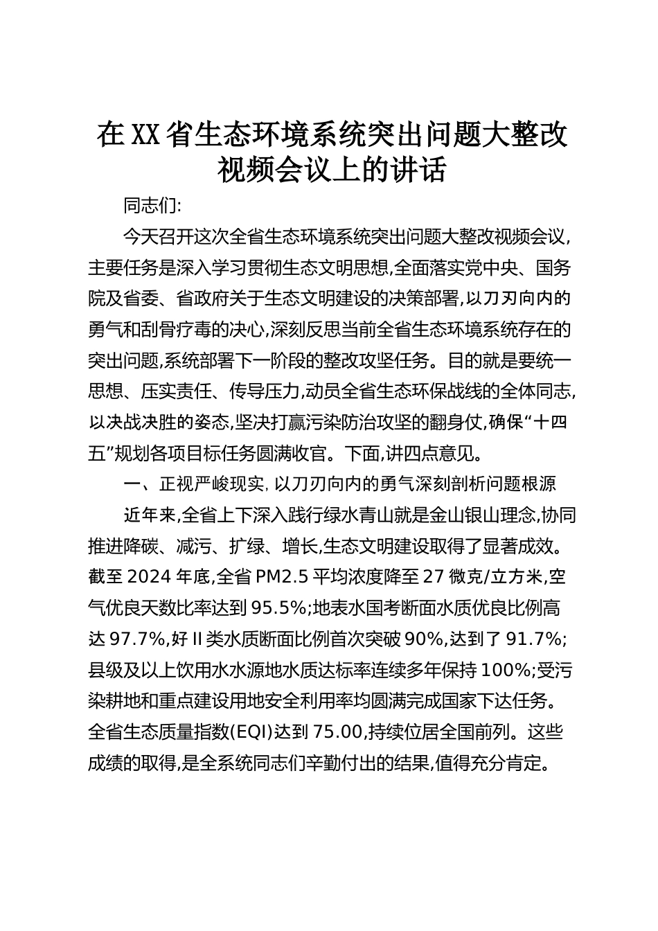 在XX省生態(tài)環(huán)境系統(tǒng)突出問題大整改視頻會議上的講話同志們:今天召開這次全省生態(tài)環(huán)境系統(tǒng)突出問題大整改視頻會議,主要任務(wù)是深入學(xué)習(xí)貫徹生態(tài)文明思想,全面落實黨中央、國務(wù)院及省委、省政府關(guān)于生態(tài)文明建設(shè)的決策部署,以刀刃向內(nèi)的勇氣和刮骨療毒的決心,深刻反思當(dāng)前全省生態(tài)環(huán)境系統(tǒng)存在的突出問題,系統(tǒng)部署下一階段的整改攻堅任務(wù)。目的就是要統(tǒng)一思想、壓實責(zé)任、傳導(dǎo)壓力,動員全省生態(tài)環(huán)保戰(zhàn)線的全體同志,以決決的姿戰(zhàn)勝態(tài),堅決打贏污染防治攻堅的翻身仗,“確保十四”五規(guī)劃各項目標(biāo)任務(wù)圓滿收官。下面,講四點意見。一、正視嚴(yán)峻現(xiàn)實,以刀刃向內(nèi)的勇氣深刻剖析問題...