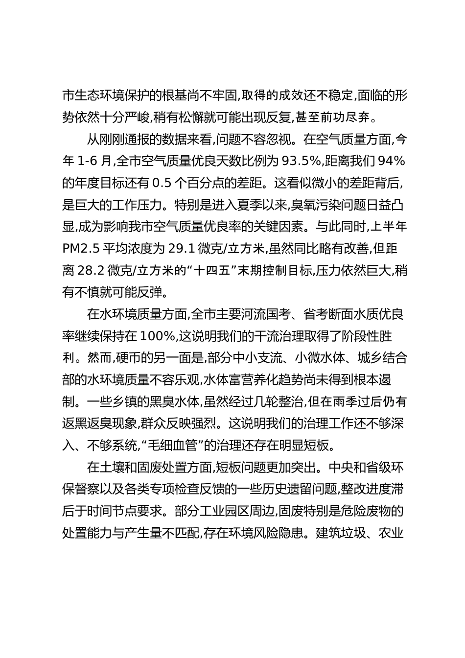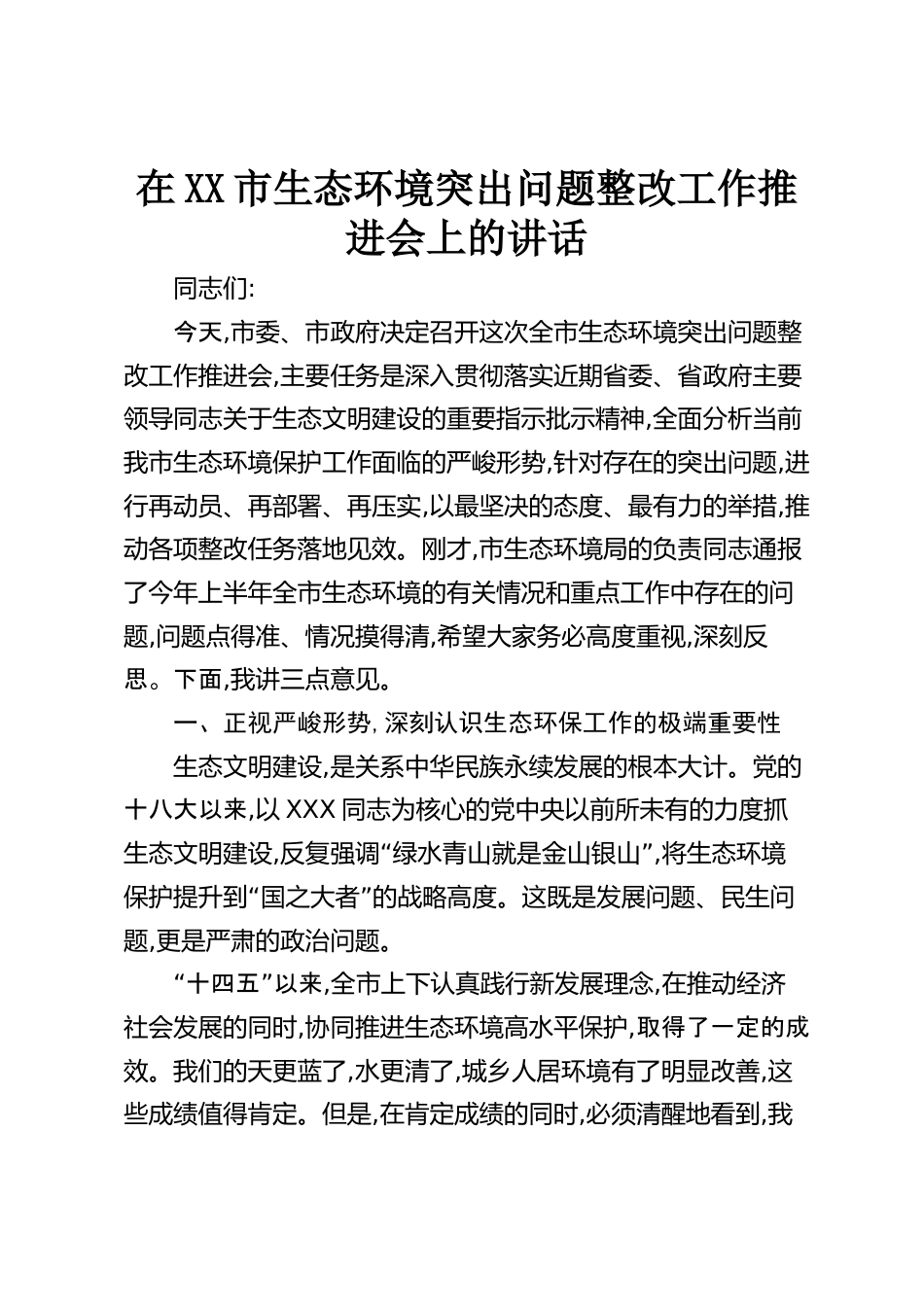 在XX市生態(tài)環(huán)境突出問題整改工作推進(jìn)會(huì)上的講話同志們:今天,市委、市政府決定召開這次全市生態(tài)環(huán)境突出問題整改工作推進(jìn)會(huì),主要任務(wù)是深入貫徹落實(shí)近期省委、省政府主要領(lǐng)導(dǎo)同志關(guān)于生態(tài)文明建設(shè)的重要指示批示精神,全面分析當(dāng)前我市生態(tài)環(huán)境保護(hù)工作面臨的嚴(yán)峻形勢(shì),針對(duì)存在的突出問題,進(jìn)行再動(dòng)員、再部署、再壓實(shí),以最堅(jiān)決的態(tài)度、最有力的舉措,推動(dòng)各項(xiàng)整改任務(wù)落地見效。剛才,市生態(tài)環(huán)境局的負(fù)責(zé)同志通報(bào)了今年上半年全市生態(tài)環(huán)境的有關(guān)情況和重點(diǎn)工作中存在的問題,問題點(diǎn)得準(zhǔn)、情況摸得清,希望大家務(wù)必高度重視,深刻反思。下面,我講三點(diǎn)意見。一、正視嚴(yán)峻形勢(shì),深刻...