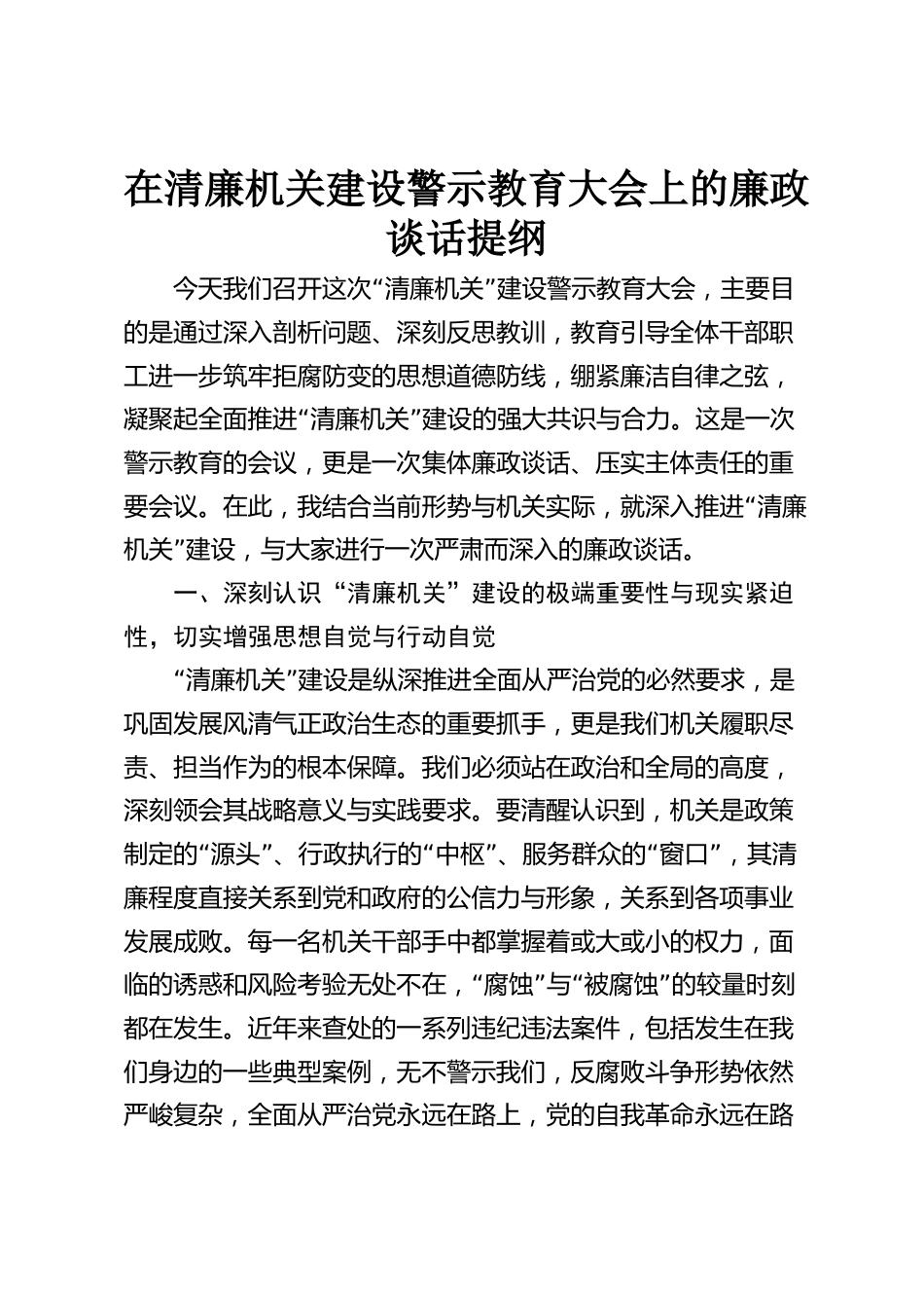 在清廉機關(guān)建設(shè)警示教育大會上的廉政談話提綱“”今天我們召開這次清廉機關(guān)建設(shè)警示教育大會,主要目的是通過深入剖析問題、深刻反思教訓,教育引導全體干部職工進一步筑牢拒腐防變的思想道德防線,繃緊廉潔自律之弦,“”凝聚起全面推進清廉機關(guān)建設(shè)的強大共識與合力。這是一次警示教育的會議,更是一次集體廉政談話、壓實主體責任的重“要會議。在此,我結(jié)合當前形勢與機關(guān)實際,就深入推進清廉”機關(guān)建設(shè),與大家進行一次嚴肅而深入的廉政談話。一、深刻認識“清廉機關(guān)”建設(shè)的極端重要性與現(xiàn)實緊迫性,切實增強思想自覺與行動自覺“”清廉機關(guān)建設(shè)是縱深推進全面從嚴...