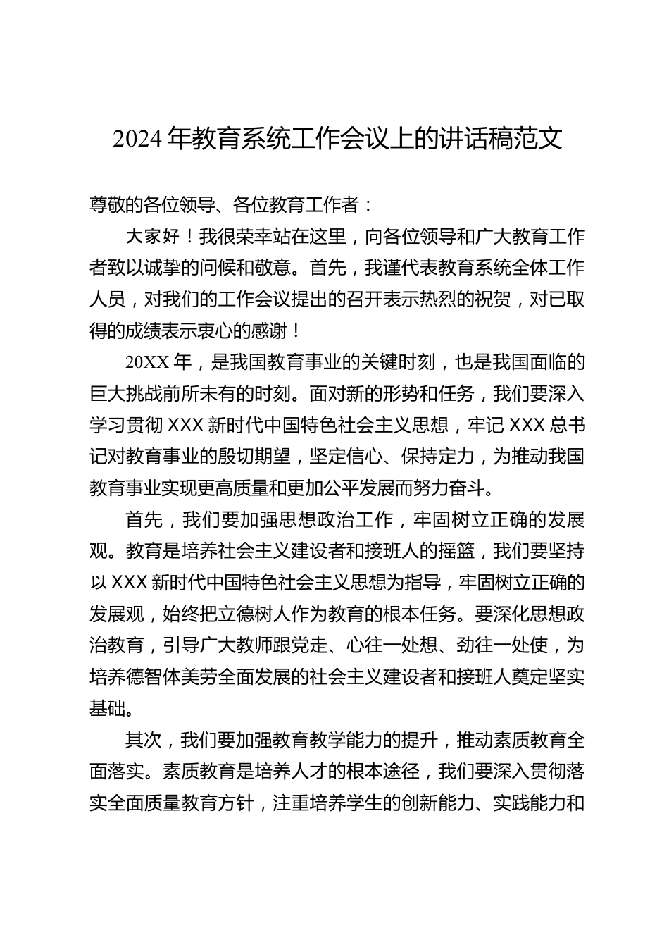 2024年教育系統(tǒng)工作會(huì)議上的講話稿范文