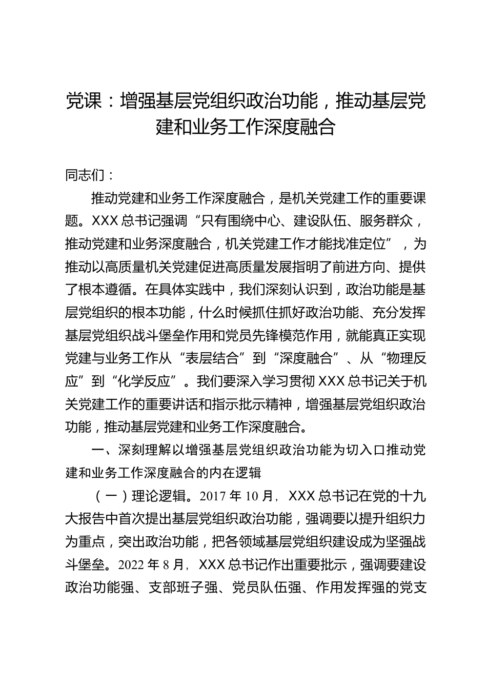 黨課:增強(qiáng)基層黨組織政治功能,推動(dòng)基層黨建和業(yè)務(wù)工作深度融合