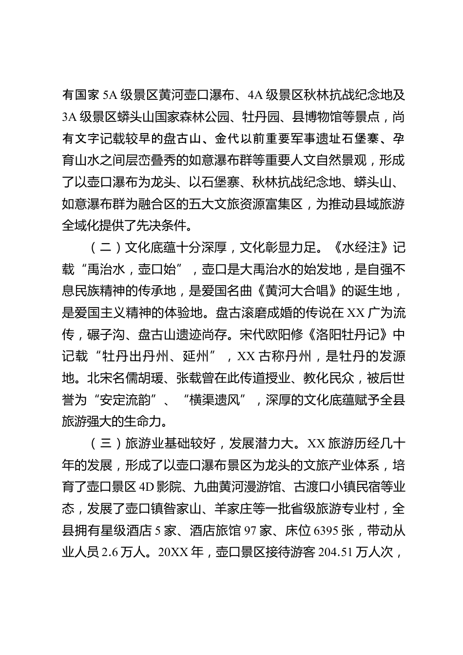 調(diào)研報告:關于XX縣文化旅游業(yè)發(fā)展的調(diào)研與思考XX地處陜西省北部、延安市東南部、黃河中游壺口瀑布之濱,國土總面積2931平方公里,轄4鎮(zhèn)2鄉(xiāng)1個街道辦事處,總人口11.2萬人。近年來,全縣上下深入學習貫徹XXX新時代中國特色社會主義思想、XXX總書記歷次來陜考察重要講話重要指示,積極融入新時代延安加快中國式現(xiàn)代化建設“一六四”工作布局,堅持以黃河流域生態(tài)保護和高質(zhì)量發(fā)展為統(tǒng)領,奮力走“生態(tài)優(yōu)先、文旅融合、立工強農(nóng)、全民營商、優(yōu)教聚才、城鄉(xiāng)共興”的高質(zhì)量發(fā)展之路,尤其是堅持把文化旅游業(yè)作為縣域首位產(chǎn)業(yè),加快推進景點觀光旅游向休閑度假旅游轉型,以壺...