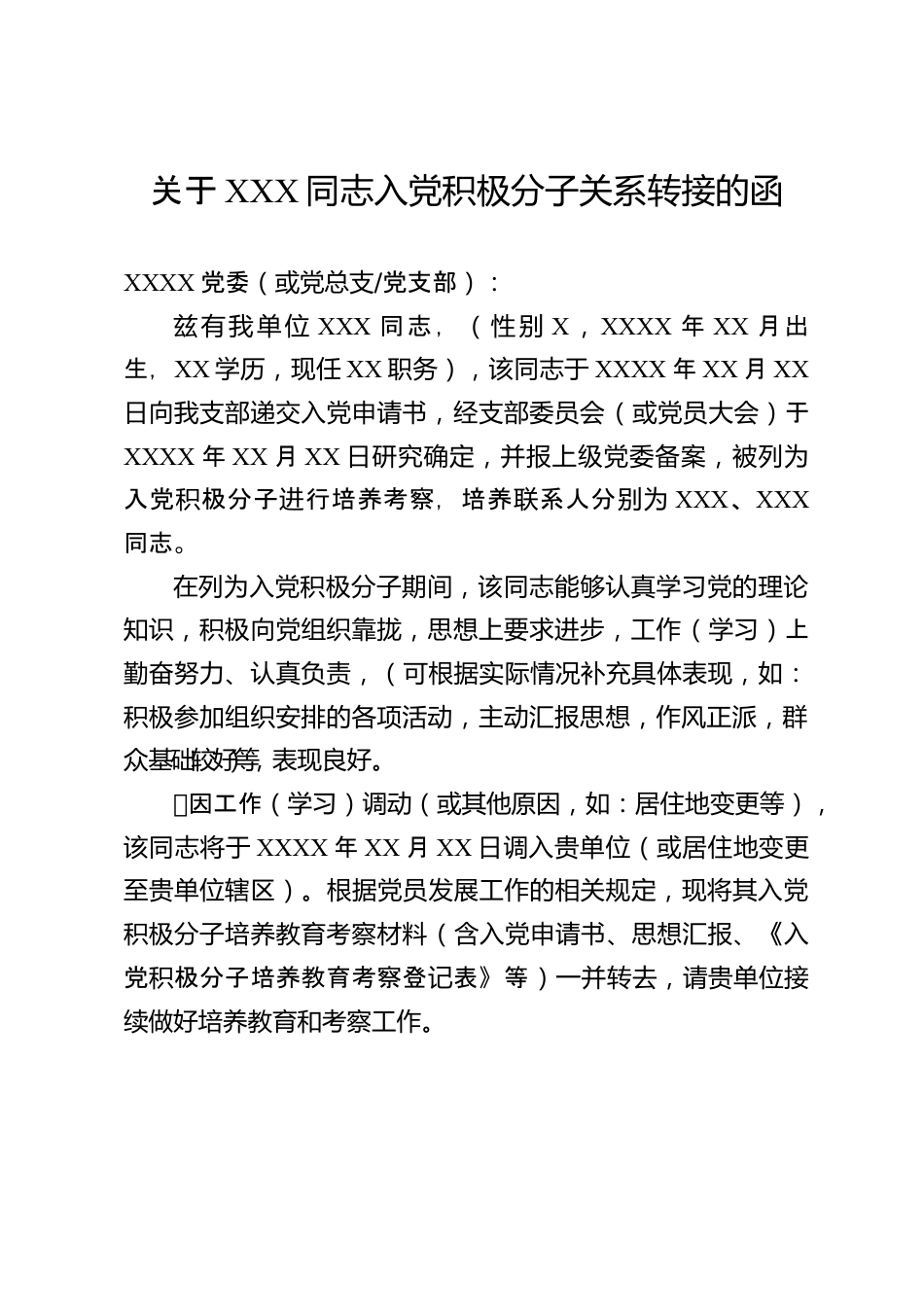 關(guān)于XXX同志入黨積極分子關(guān)系轉(zhuǎn)接的函