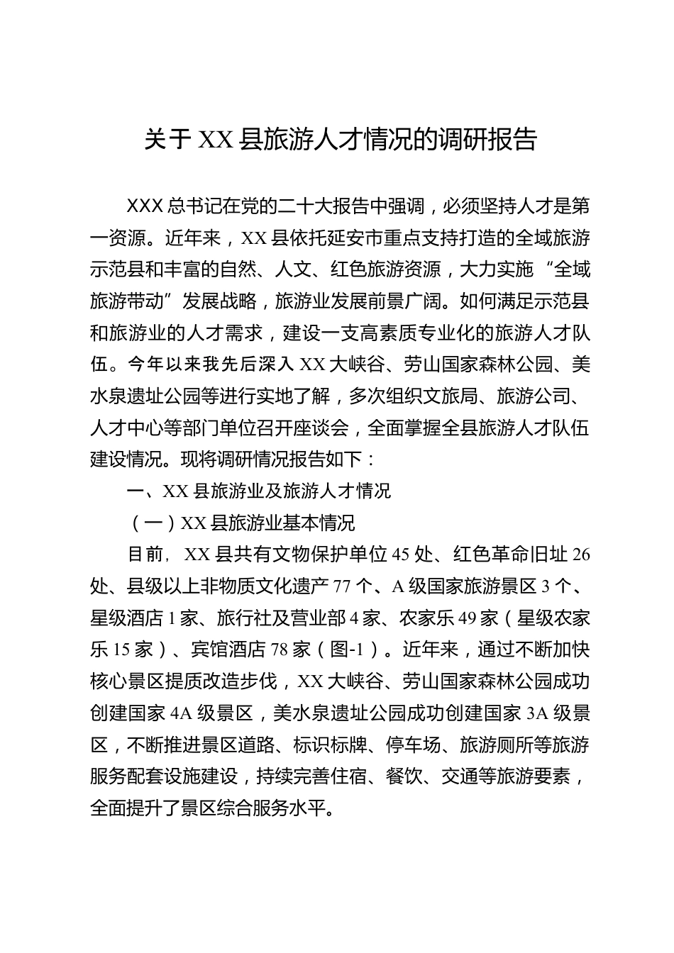 關(guān)于XX縣旅游人才情況的調(diào)研報(bào)告XXX總書(shū)記在黨的二十大報(bào)告中強(qiáng)調(diào),必須堅(jiān)持人才是第一資源。近年來(lái),XX縣依托延安市重點(diǎn)支持打造的全域旅游示范縣和豐富的自然、人文、紅色旅游資源,大力實(shí)施“全域旅游帶動(dòng)”發(fā)展戰(zhàn)略,旅游業(yè)發(fā)展前景廣闊。如何滿(mǎn)足示范縣和旅游業(yè)的人才需求,建設(shè)一支高素質(zhì)專(zhuān)業(yè)化的旅游人才隊(duì)伍。今年以來(lái)我先后深入XX大峽谷、勞山國(guó)家森林公園、美水泉遺址公園等進(jìn)行實(shí)地了解,多次組織文旅局、旅游公司、人才中心等部門(mén)單位召開(kāi)座談會(huì),全面掌握全縣旅游人才隊(duì)伍建設(shè)情況?,F(xiàn)將調(diào)研情況報(bào)告如下:一、XX縣旅游業(yè)及旅游人才情況(一)XX縣旅游業(yè)基...