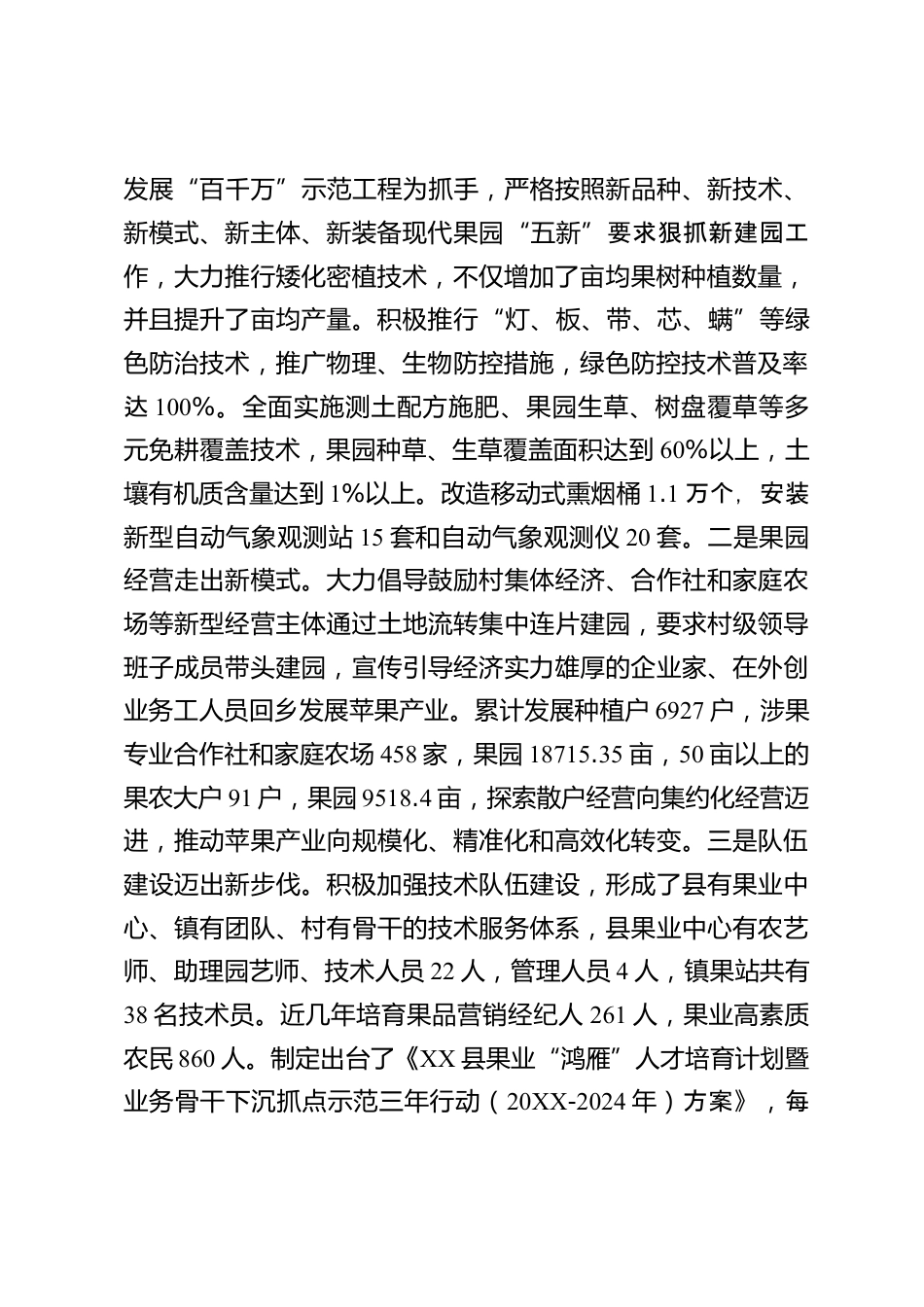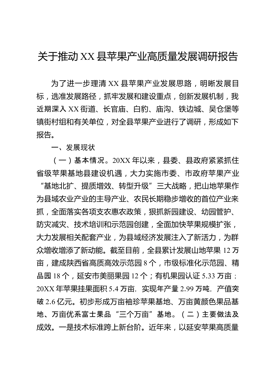 關于推動XX縣蘋果產業(yè)高質量發(fā)展調研報告為了進一步理清XX縣蘋果產業(yè)發(fā)展思路,明晰發(fā)展目標,選準發(fā)展路徑,抓牢發(fā)展和建設重點,創(chuàng)新發(fā)展機制,我近期深入XX街道、長官廟、白豹、廟溝、鐵邊城、吳倉堡等鎮(zhèn)街村組和有關單位,對全縣蘋果產業(yè)進行了調研,形成如下報告。一、發(fā)展現(xiàn)狀(一)基本情況。20XX年以來,縣委、縣政府緊緊抓住省級蘋果基地縣建設機遇,大力實施市委、市政府蘋果產業(yè)“基地北擴、提質增效、轉型升級”三大戰(zhàn)略,把山地蘋果作為縣域農業(yè)產業(yè)的主導產業(yè)、農民長期穩(wěn)步增收的首位產業(yè)來抓,全面落實各項支農惠農政策,狠抓新園建設、幼園管護、防災減...