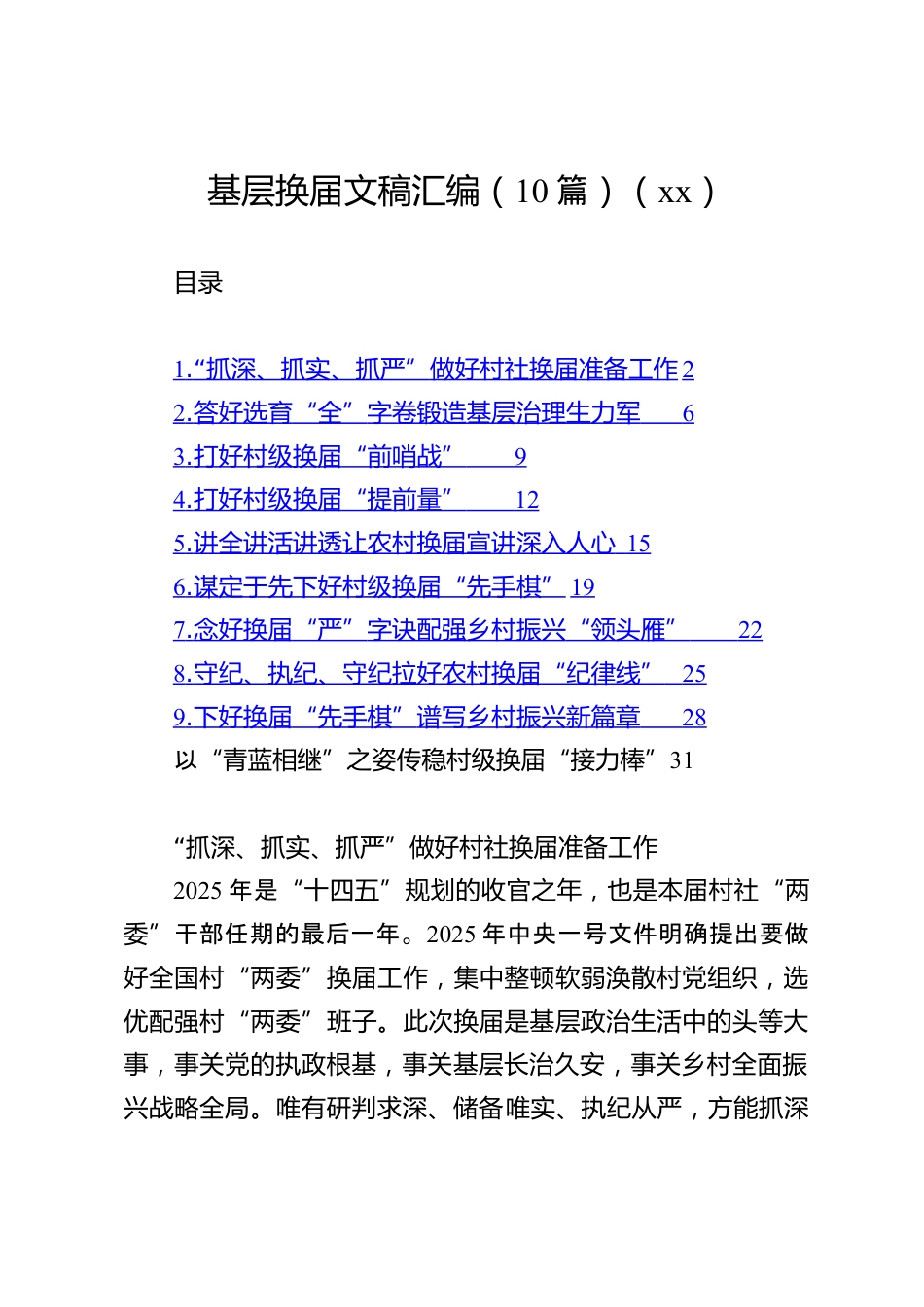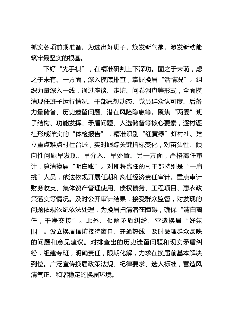 基層換屆文稿匯編(10篇)(xx)目錄1.“抓深、抓實、抓嚴(yán)”做好村社換屆準(zhǔn)備工作22.答好選育“全”字卷鍛造基層治理生力軍63.打好村級換屆“前哨戰(zhàn)”94.打好村級換屆“提前量”125.講全講活講透讓農(nóng)村換屆宣講深入人心156.謀定于先下好村級換屆“先手棋”197.念好換屆“嚴(yán)”字訣配強鄉(xiāng)村振興“領(lǐng)頭雁”228.守紀(jì)、執(zhí)紀(jì)、守紀(jì)拉好農(nóng)村換屆“紀(jì)律線”259.下好換屆“先手棋”譜寫鄉(xiāng)村振興新篇章28以“青藍相繼”之姿傳穩(wěn)村級換屆“接力棒”31“抓深、抓實、抓嚴(yán)”做好村社換屆準(zhǔn)備工作2025年是“十四五”規(guī)劃的收官之年,也是本屆村社“兩委”干部任期的最后一年。2025年中...