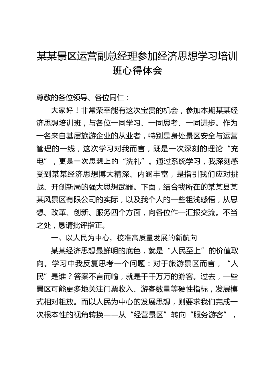 某某景區(qū)運營副總經(jīng)理參加經(jīng)濟思想學(xué)習(xí)培訓(xùn)班心得體會尊敬的各位領(lǐng)導(dǎo)、各位同仁:大家好!非常榮幸能有這次寶貴的機會,參加本期某某經(jīng)濟思想培訓(xùn)班,與各位一同學(xué)習(xí)、一同思考、一同進步。作為一名來自基層旅游企業(yè)的從業(yè)者,特別是身處景區(qū)安全與運營管理的一線,這次學(xué)習(xí)對我而言,既是一次深刻的理論“充電”,更是一次思想上的“洗禮”。通過系統(tǒng)學(xué)習(xí),我深刻感受到某某經(jīng)濟思想博大精深、內(nèi)涵豐富,是指引我們應(yīng)對挑戰(zhàn)、開創(chuàng)新局的強大思想武器。下面,結(jié)合我所在的某某縣某某風(fēng)景區(qū)有限公司的實際,以及我個人的一些粗淺感悟,從思想、改革、創(chuàng)新、服務(wù)四個方面,...
