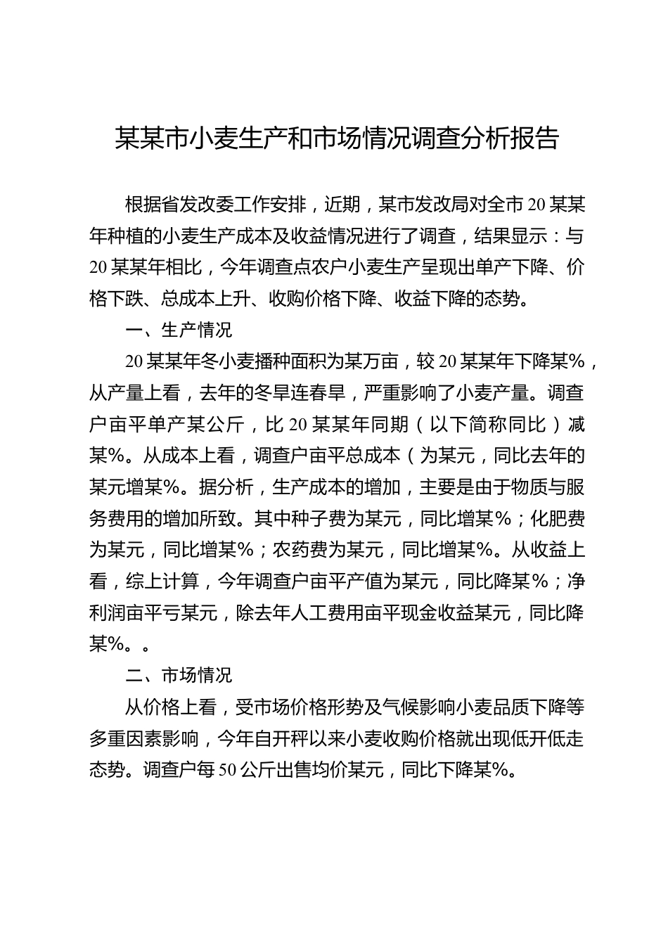 某某市小麥生產(chǎn)和市場情況調(diào)查分析報告根據(jù)省發(fā)改委工作安排,近期,某市發(fā)改局對全市20某某年種植的小麥生產(chǎn)成本及收益情況進(jìn)行了調(diào)查,結(jié)果顯示:與20某某年相比,今年調(diào)查點農(nóng)戶小麥生產(chǎn)呈現(xiàn)出單產(chǎn)下降、價格下跌、總成本上升、收購價格下降、收益下降的態(tài)勢。一、生產(chǎn)情況20某某年冬小麥播種面積為某萬畝,較20某某年下降某%,從產(chǎn)量上看,去年的冬旱連春旱,嚴(yán)重影響了小麥產(chǎn)量。調(diào)查戶畝平單產(chǎn)某公斤,比20某某年同期(以下簡稱同比)減某%。從成本上看,調(diào)查戶畝平總成本(為某元,同比去年的某元增某%。據(jù)分析,生產(chǎn)成本的增加,主要是由于物質(zhì)與服務(wù)費用的增加...