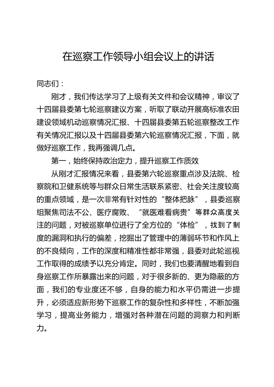 在巡察工作領(lǐng)導(dǎo)小組會(huì)議上的講話同志們:剛才,我們傳達(dá)學(xué)習(xí)了上級(jí)有關(guān)文件和會(huì)議精神,審議了十四屆縣委第七輪巡察建議方案,聽(tīng)取了聯(lián)動(dòng)開(kāi)展高標(biāo)準(zhǔn)農(nóng)田建設(shè)領(lǐng)域機(jī)動(dòng)巡察情況匯報(bào)、十四屆縣委第五輪巡察整改工作有關(guān)情況匯報(bào)以及十四屆縣委第六輪巡察情況匯報(bào),下面,就做好巡察工作,我再?gòu)?qiáng)調(diào)幾點(diǎn)。第一,始終保持政治定力,提升巡察工作質(zhì)效從剛才匯報(bào)情況來(lái)看,縣委第六輪巡察重點(diǎn)涉及法院、檢察院和衛(wèi)健系統(tǒng)等與群眾日常生活聯(lián)系緊密、社會(huì)關(guān)注度較高的重點(diǎn)領(lǐng)域,是一次非常有針對(duì)性的“整體把脈”,縣委巡察組聚焦司法不公、醫(yī)療腐敗、“就醫(yī)難看病貴”等群眾高度關(guān)...
