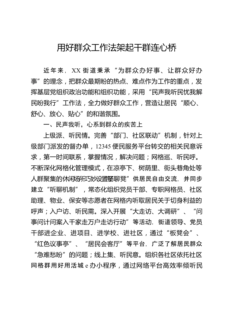 用好群眾工作法架起干群連心橋近年來(lái),XX街道秉承“為群眾辦好事、讓群眾好辦事”的理念,把群眾最期盼的熱點(diǎn)、難點(diǎn)作為工作的重點(diǎn),發(fā)揮基層黨組織政治功能和組織功能,采用“民聲我聽(tīng)民憂我解民盼我行”工作法,全力做好群眾工作,營(yíng)造讓居民“順心、舒心、放心、貼心”的和諧氛圍。一、民聲我聽(tīng),心系到群眾的疾苦上上級(jí)派、聽(tīng)民情。完善“部門、社區(qū)聯(lián)動(dòng)”機(jī)制,針對(duì)上級(jí)部門派發(fā)的督辦單,12345便民服務(wù)平臺(tái)轉(zhuǎn)交的相關(guān)民意訴求,第一時(shí)間聯(lián)系,掌握情況,解決問(wèn)題;網(wǎng)格巡、聽(tīng)民呼。不斷深化網(wǎng)格化管理模式,在涼亭下、樹(shù)蔭里、街頭巷角處等人群聚集的休閑場(chǎng)所巧妙...