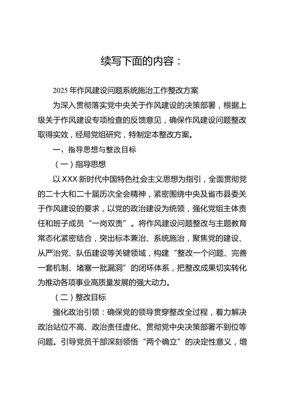 續(xù)寫下面的內(nèi)容:2025年作風(fēng)建設(shè)問(wèn)題系統(tǒng)施治工作整改方案為深入貫徹落實(shí)黨中央關(guān)于作風(fēng)建設(shè)的決策部署,根據(jù)上級(jí)關(guān)于作風(fēng)建設(shè)專項(xiàng)檢查的反饋意見(jiàn),確保作風(fēng)建設(shè)問(wèn)題整改取得實(shí)效,經(jīng)局黨組研究,特制定本整改方案。一、指導(dǎo)思想與整改目標(biāo)(一)指導(dǎo)思想以XXX新時(shí)代中國(guó)特色社會(huì)主義思想為指引,全面貫徹黨的二十大和二十屆歷次全會(huì)精神,緊密圍繞中央及省市縣委關(guān)于作風(fēng)建設(shè)的要求,以黨的政治建設(shè)為統(tǒng)領(lǐng),強(qiáng)化黨組主體責(zé)任和班子成員“一崗雙責(zé)”。將作風(fēng)建設(shè)問(wèn)題整改與主題教育常態(tài)化緊密結(jié)合,突出標(biāo)本兼治、系統(tǒng)施治,聚焦黨的建設(shè)、從嚴(yán)治黨、隊(duì)伍建設(shè)等關(guān)鍵領(lǐng)域...