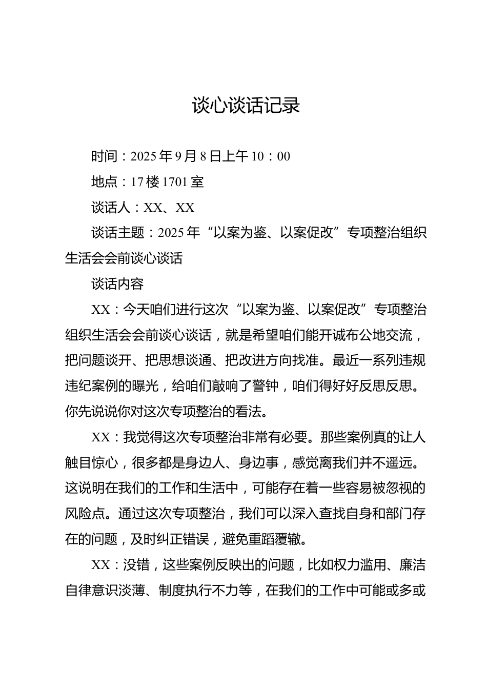 談心談話記錄時間:2025年9月8日上午10:00地點:17樓1701室談話人:XX、XX談話主題:2025年“以案為鑒、以案促改”專項整治組織生活會會前談心談話談話內容XX:今天咱們進行這次“以案為鑒、以案促改”專項整治組織生活會會前談心談話,就是希望咱們能開誠布公地交流,把問題談開、把思想談通、把改進方向找準。最近一系列違規(guī)違紀案例的曝光,給咱們敲響了警鐘,咱們得好好反思反思。你先說說你對這次專項整治的看法。XX:我覺得這次專項整治非常有必要。那些案例真的讓人觸目驚心,很多都是身邊人、身邊事,感覺離我們并不遙遠。這說明在我們的工作和生活中,可能存在...