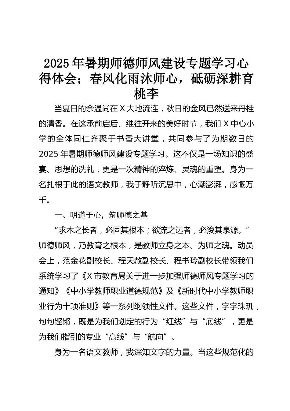 2025年暑期師德師風(fēng)建設(shè)專題學(xué)習(xí)心得體會(huì);春風(fēng)化雨沐師心,砥礪深耕育桃李