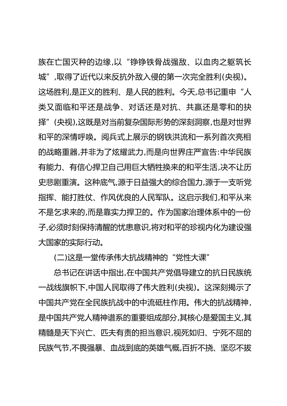 XX單位干部學(xué)習(xí)XXX總書記閱兵式重要講話精神的心得體會2025年9月3日,一個注定被億萬中華兒女銘記的日子。當(dāng)雄壯的《義勇軍進(jìn)行曲》響徹XX廣場,當(dāng)整齊劃一的受閱方隊以鏗鏘有力的步伐通過檢閱臺,當(dāng)一件件國之重器承載著民族的希望與榮光震撼亮相,我的內(nèi)心與全國人民一道,經(jīng)歷了長久的激蕩與澎湃。作為一名在基層工作多年的機關(guān)干部,我通過屏幕觀看了紀(jì)念中國人民抗日戰(zhàn)爭暨世界反法西斯戰(zhàn)爭勝利80周年大會的盛況,并認(rèn)真聆聽了XXX總書記的重要講話。這不僅僅是一場視覺的盛宴、一次國力的展示,更是一場深刻的愛國主義教育和一次觸及靈魂的精神洗禮??倳浀闹v話高屋建瓴、...